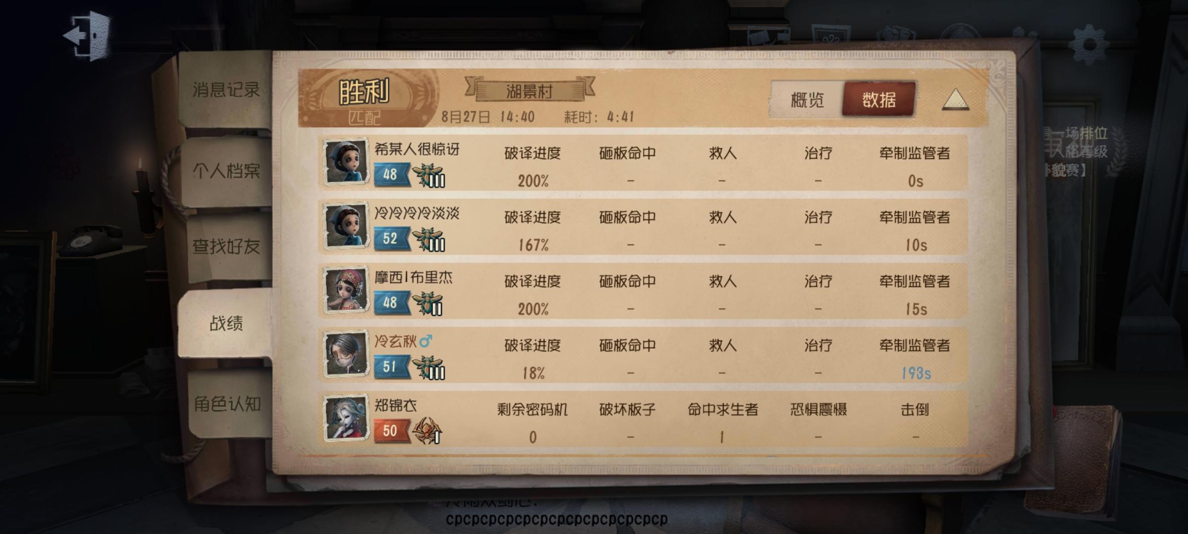 这游戏真的服了,这游戏有些人素质真的差,我玩舞女,一局下来监督者一直追我,不追别人,而且把我从狂欢之椅弄死后游戏就结束了,赛后结束,那几个求生者一直嘲讽我,舞女不会玩,还有拼音打出cai jiu shi cai后面还跟同上,杰克不会溜,监督者太可伶等等,我真的气炸了,人让他们试试就追一人,我溜给个屁呀,一群人就在旁边看着,呵呵了,真的是第一次见过游戏中的这种嘲讽,我记住了,我给那些人都举报了,喜欢