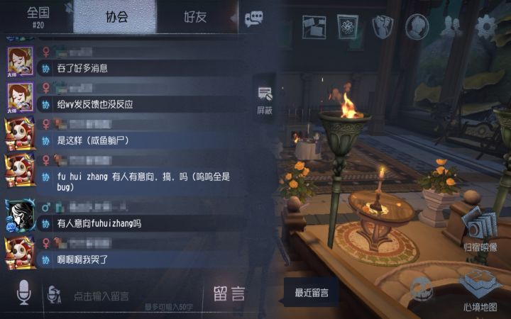 协会聊天框好奇妙,反正我这里好多消息被吞现象……基本上发四五条只剩下一两条被看见,一开始的没截图就已经没了咳咳,以下截图了一丢丢,参考一下反正……修复一下顺便加个发言时间最好,而且感觉好像还得刷一下账号登陆才能看到发言,还有时候登录后发现以前的消息都没了协会框一片空白…心好累。这个聊天框子太简陋了叭……