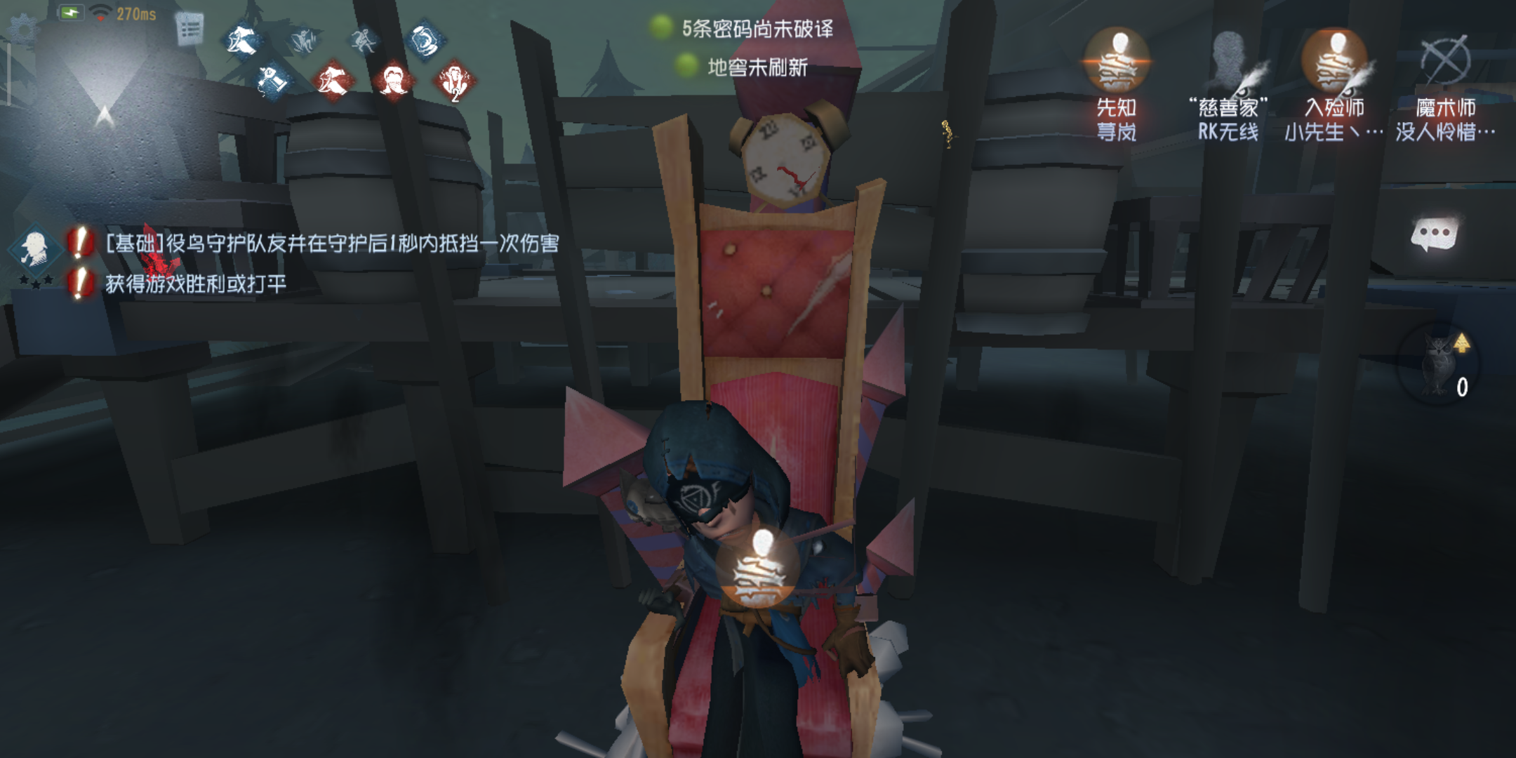 1.追击空刀,闪现空刀各种空刀,求生者围着你绕圈看你空刀。接板,刹那接板各种接板,求生者蹲在板子后看你接板。追人打窗打板子打椅子打电机,能打中的只有开香水的调香,遁地的守墓人和交鸟的先知(好吧夸张了)。追人没追多久电机砰砰砰开三台。网络不好的求生那一堆金皮紫皮的特效也能卡死你。求生网卡打不到,自己网卡追丢人。好不容易二挂上一个人,随便来个人再救一波,砰,机子开了,一刀斩好不容易留个人