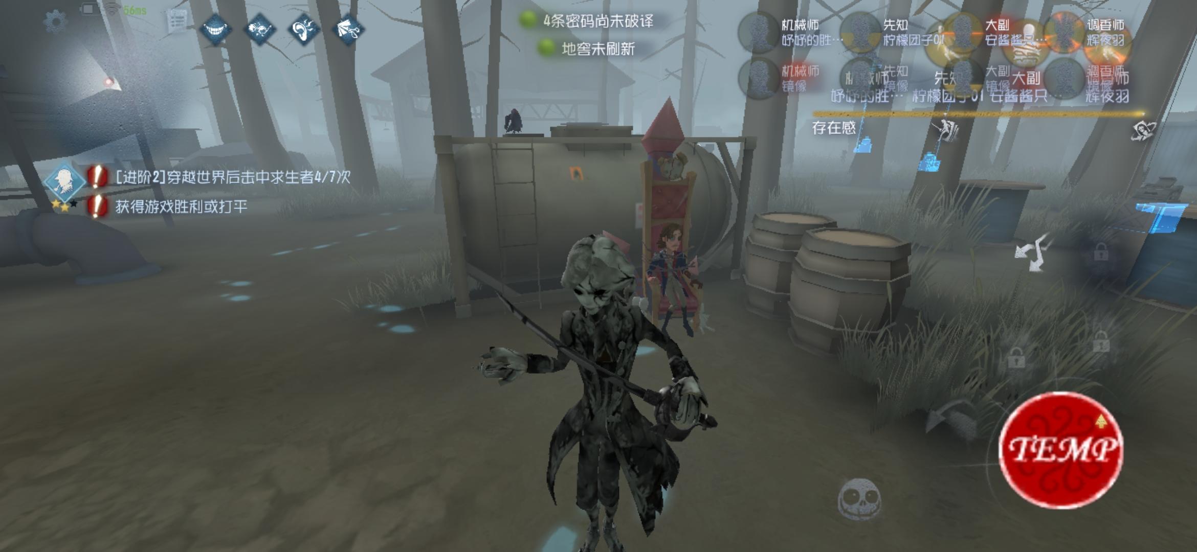 如图还有几张忘记截图了内容:技能可以照常使用(虽然貌似没有解锁),但贴图出误,使用技能后,出现了类似鬼脸的技能图案(偷跑?),破译完成密码机呈现蓝色状态触发原因:突然断线重连