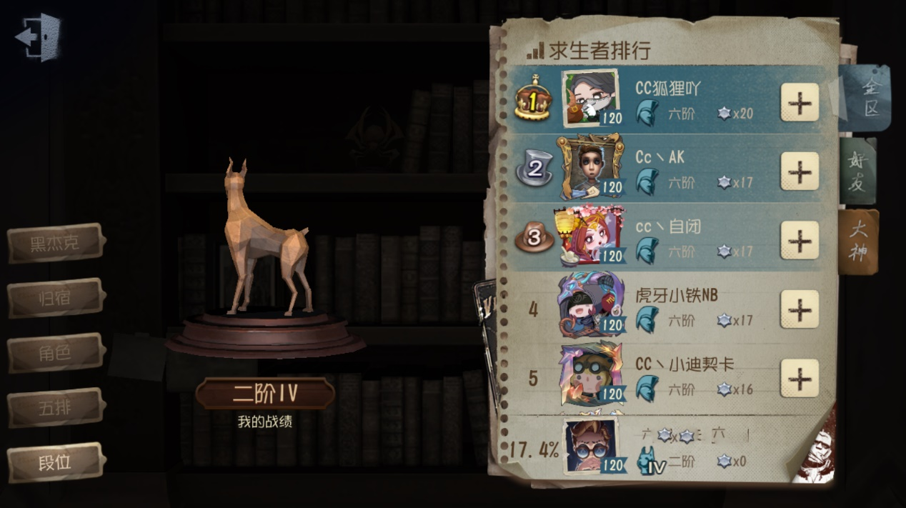 翻窗速度:厂长,约瑟夫,鹿头和小丑,小白,红蝶和孽蜥,使徒,信徒,邦邦,罗比,杰克,小黑,红夫人,鱿鱼,疯眼,蜘蛛踩板速度:约瑟夫,疯眼,小黑,使徒,红蝶(这么快啊),罗比,杰克,孽蜥,信徒,鱿鱼,小白,邦邦,红夫人,厂长,蜘蛛,小丑,鹿头被砸恢复时间:小黑,鱿鱼,鹿头,罗比,红蝶,邦邦,使徒,杰克,红夫人,蜘蛛,约瑟夫,孽蜥,厂长,信徒,小丑,疯眼,小白普攻硬直 擦刀:约瑟夫,信徒,小黑,