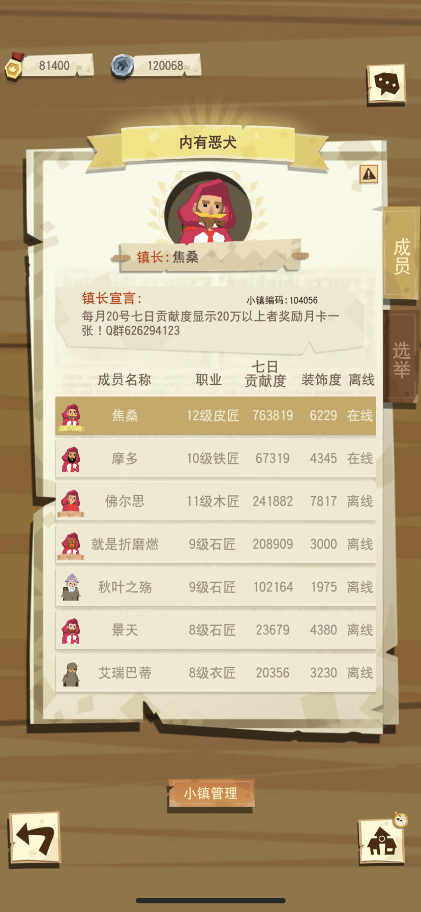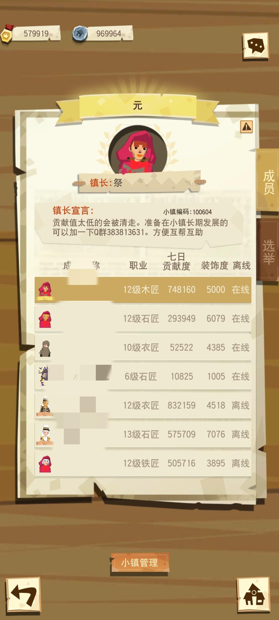 六级小镇收人,编号:107730,Q群号:629643988(必加,不加踢),不强制填箱,诚招9级及以上铁匠或者12级及以上石匠(石匠要能扔工艺品)(铁匠要能提供金工具,不强制每天提供)小镇氛围和谐,养老小镇,现只差100w资金升七