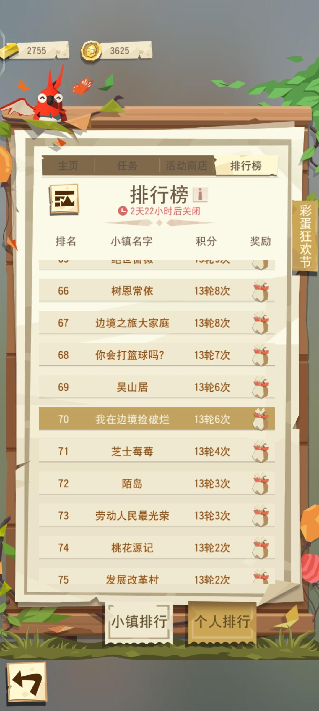 四级佛系小镇求伙伴( ´▽`)本来旧版本我是一个人solo的,玩着也还好。但是新版本玩法改版以后,小镇里还是得有伙伴才好玩。小镇里目前就我和镇长两个活人,我俩都是石匠,什么皮匠、铁匠、木匠、衣匠都可以来哦。我们不肝的(。ì _ í。)能填箱就行,一周填一个也没关系。总之,很期待能有小伙伴加入(⁎⁍̴̛ᴗ⁍̴̛⁎)