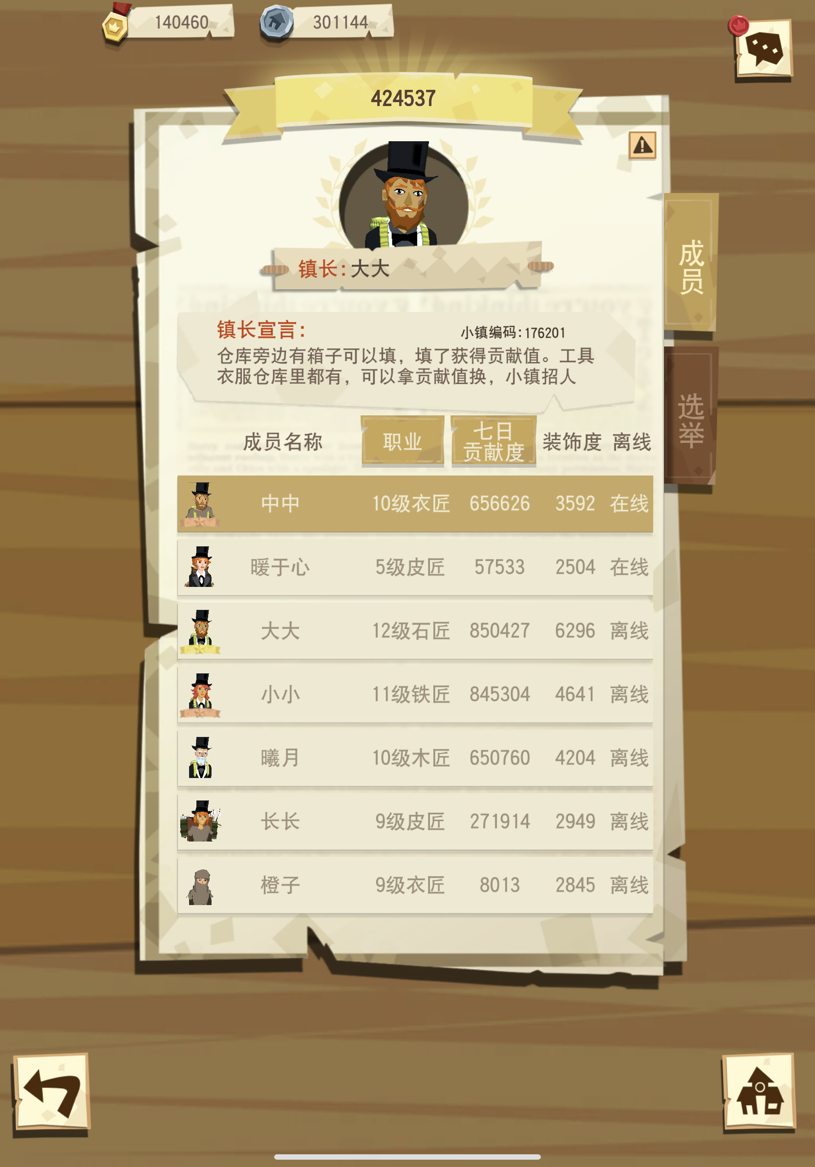 更新,还是收高级木匠衣匠。目前个人4个在榜20,小镇前十。-----------------------------------14个人,8月26从原来小镇独立出来,创建了如今的小镇。我们众志成城齐心协力,仅用了两天便回到6级并于9月2日到达7级。独立之初我们仅有1人642,1人288,到现在3人902,全员288,我们的目标是边境尽头。我们从不谈论自身的亏损,我们互相心疼他人的付出,我们