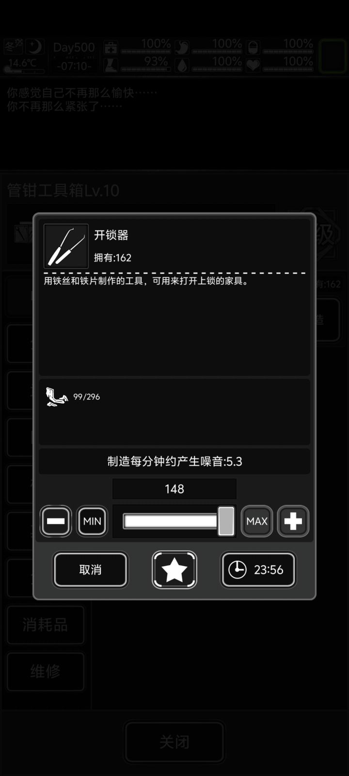 1.准备大量的水和食物收藏到最顶层,这里我选择的是面包和水。2.准备大量的金属碎片,用来制作开锁器(金属碎片去肯特的委托换)3.把阵型摆好,床、管钳工具箱、浴缸摆在一起4.把门升到满级并修满(这里我为了完成被偷窃的成就任务所以没有修满,推荐大家云存之后再去修满)5.准备好一切之后云存,开始水天数,做开锁器,吃饭喝水,睡觉,拉了之后洗澡,重复这个流程直到水到100天,然后返回主界面保存一下成