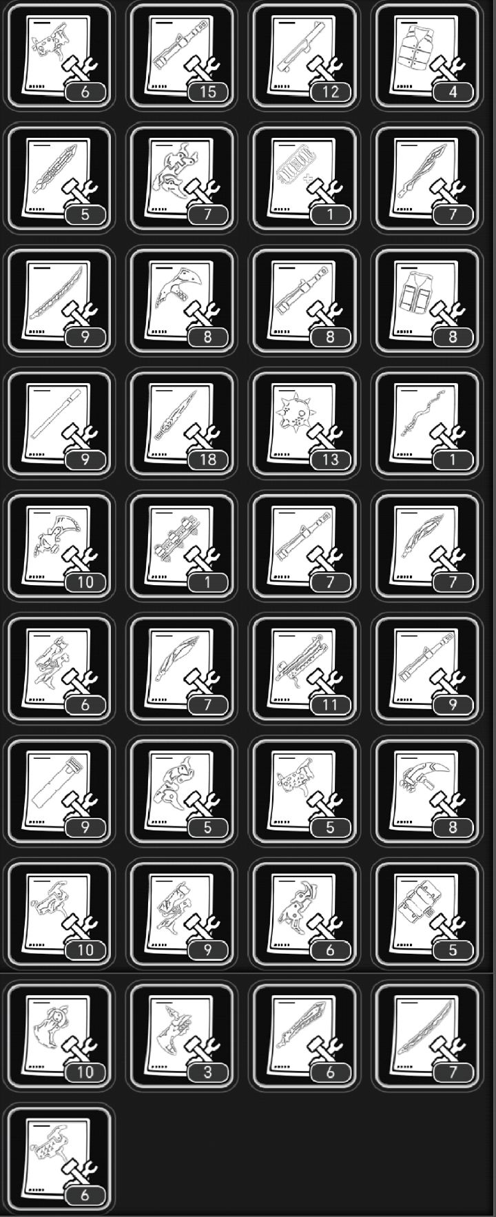 未鉴定图纸可在撒旦苏处购买获得。5级未鉴定图纸107开始能在撒旦苏处购买。以下便是所有未鉴定5级改造图纸可鉴定出的5级改造图纸。还是老样子,因为图片数据有些大,点开以后让它加载一会,都是原图,可以看清的。 总览数据来自9.22版本,总计37种然后就是一些其余的图纸,不是很重要