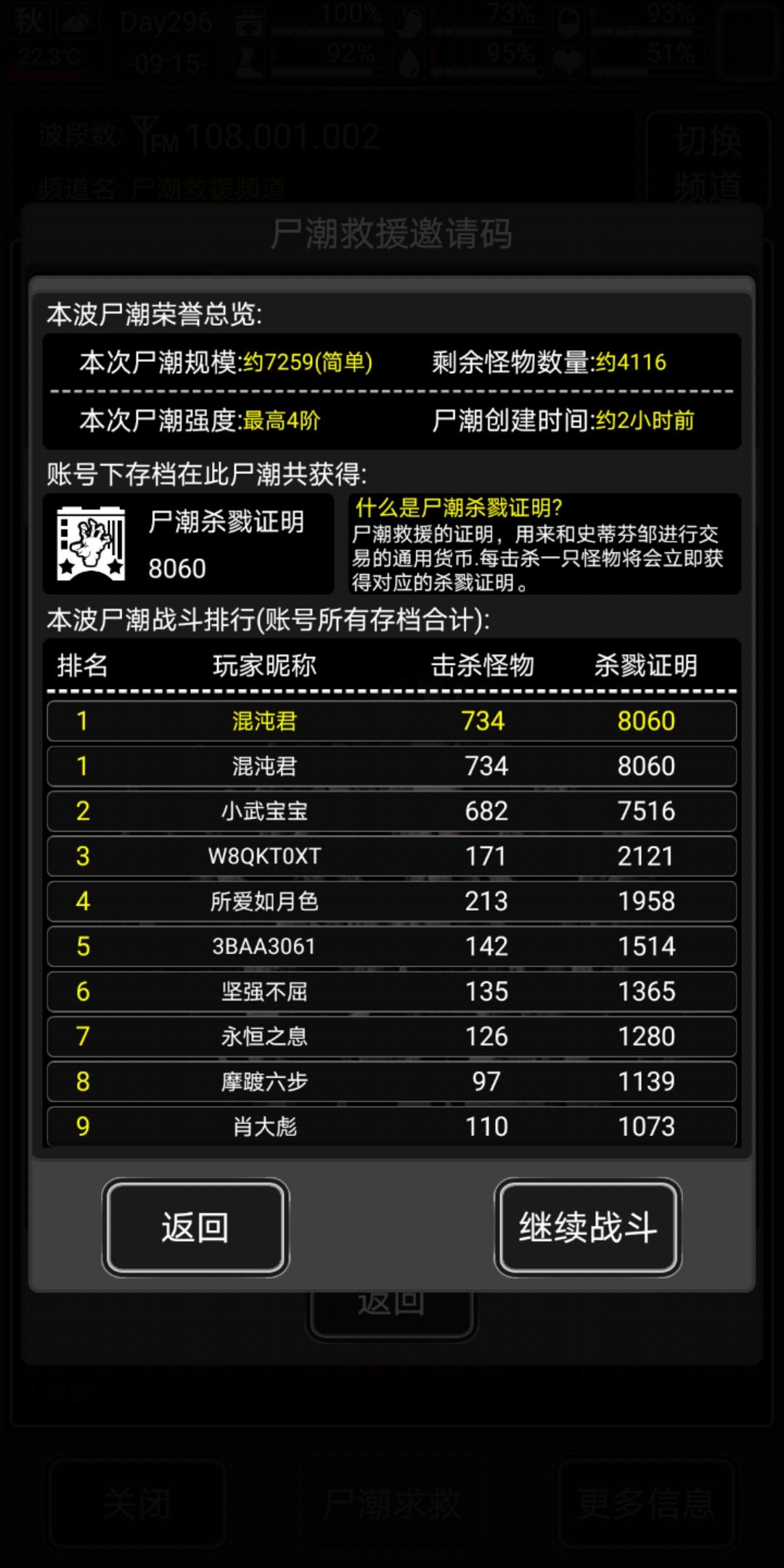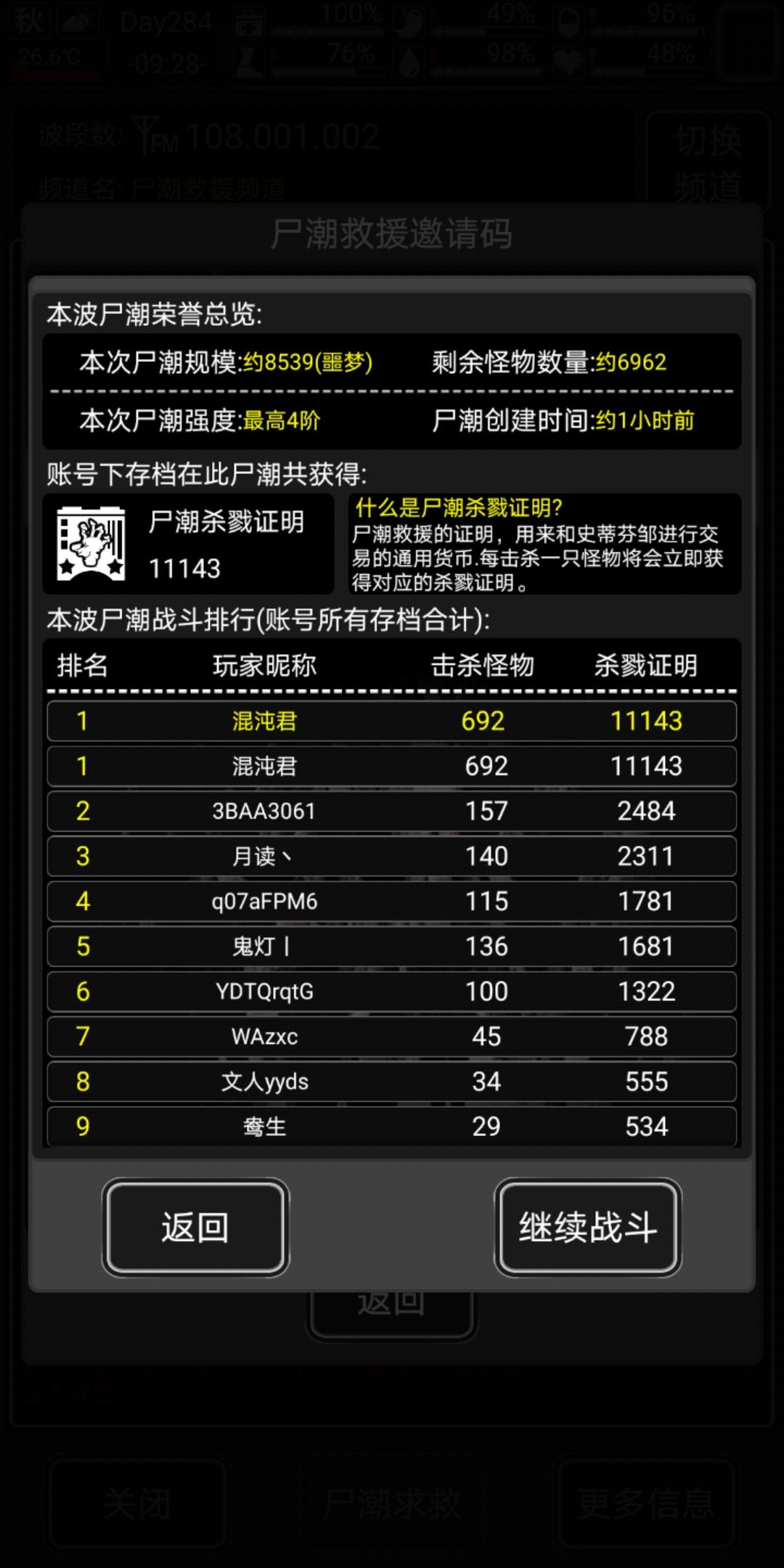 刷尸潮记录贴。每次刷尸潮的当天不会打除尸潮以外的怪物,每天打尸潮前会吧救援清零。(可能楼主有时会忘了,如果看到数据明显异常记得叫我)记录在下方(低阶尸潮我用休息引怪的方法打,高阶尸潮我只主动打六七阶):