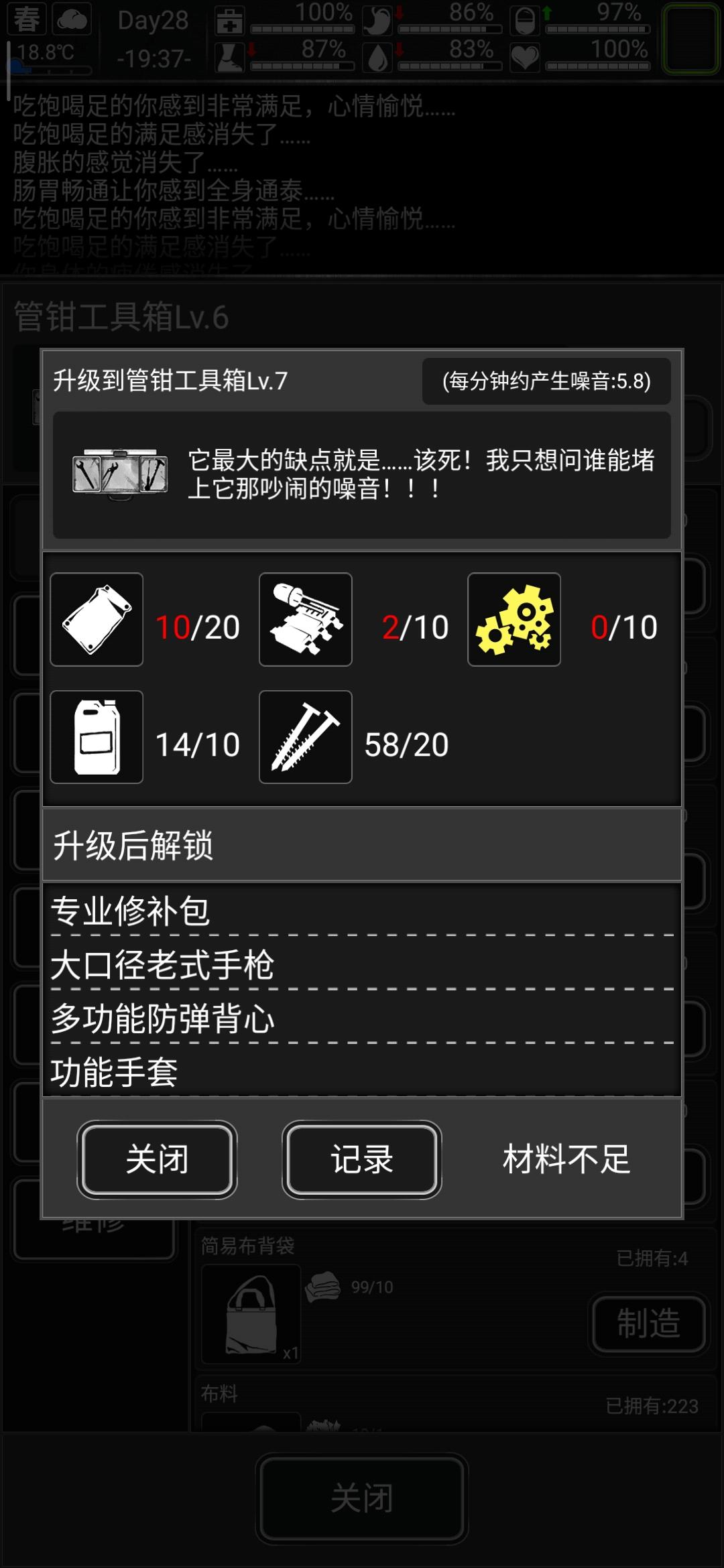 为了打到那个连金属长矛都只掉1滴血的6阶杀戮君王,我一开始还傻傻地收集材料准备升工具箱拿装备收集到一半我才反应过来,不对啊,这得收集到什么时候?完全看不到头,于是我一气之下合了血网,毒瓶,燃烧瓶,去跟他算账去了一套下来打完还剩不少算下来只用了15个血网,36个毒瓶,32个燃烧瓶,便宜易得,省心。就是没掉六血,忘记留丝血回档了。不过剧情模式也没什么用。