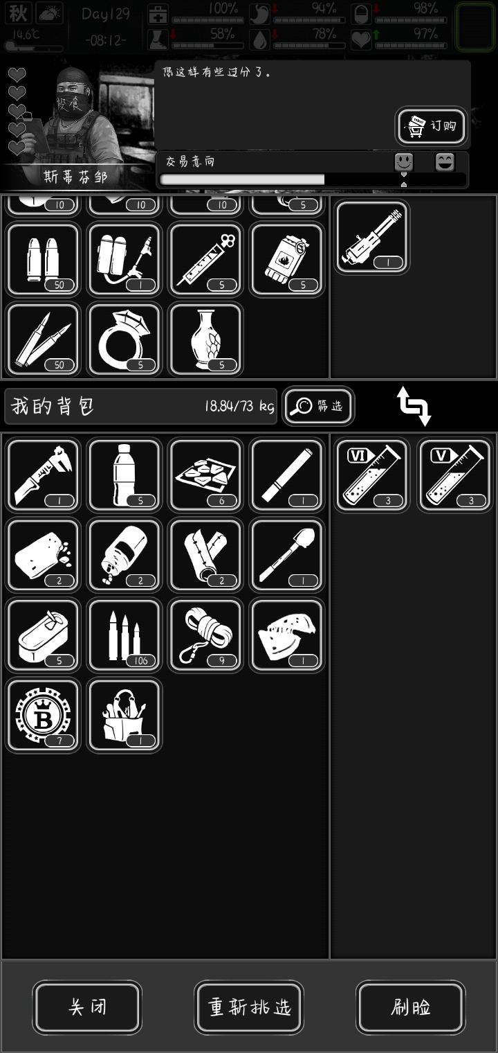 老档毕业啦,从新玩了个新档,还是新档有意思,简单说下开局攻略。下面开始速成大法:花最少的时间赚取最大的收益 1.开局经量离污染区半个小时车程(地球人都知道) 2.开局第一天只搜食品店、医院、🏥商场商场会出双肩背包,一出就是好几个,第二天找商人换吃喝,在加上在食品店搜刮到的,过好第一天没啥问题3.注意事项,炼狱噩梦春天很冷,用体力超费,开局进门偷20个木头看门小怪打掉,垃圾桶打掉有铁,捡座