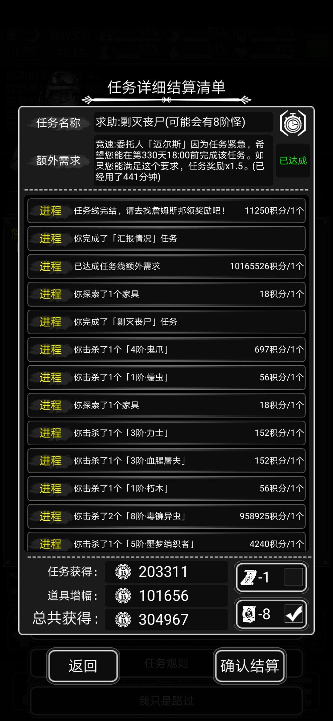萌新200来天,活到现在做任务发现,最完美的任务是清剿丧尸+竞速,因为清剿任务每杀一只怪给的积分,也就是瓶盖,会比找物品,找人,探索这3种多30%左右(我是炼狱普通咸鱼,7级怪清剿给147000+。其他三个要求下给110000+),但是进入建筑和摸东西的积分比其他三种要求下少很多,不过这刚好能让我不去捡垃圾专心打怪更容易完成竞速。目前只做过一次8级任务,清剿的8级任务每层最多4只8级怪,不知道其