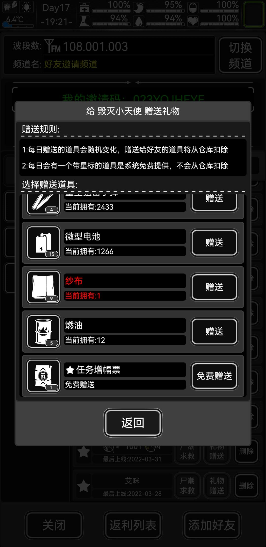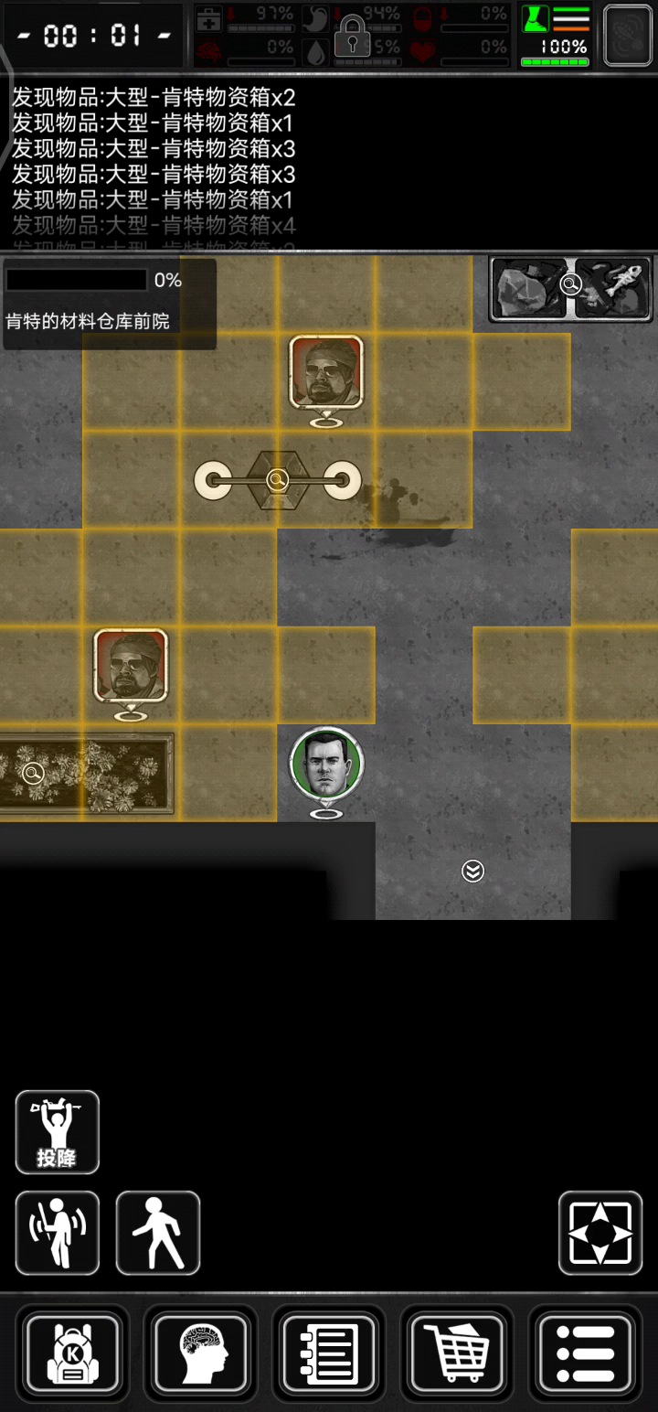7状态,很多新手开局没几天发现莫名其妙健康和心情扣的贼猛,然后,无力回天,解决方案,时不时看一下上方方框里的信息,有状态会说,还有就是看一下你的健康和心情,如果你其他4维没有变红的情况扣到95以下那就很可能是有什么状态变化了,点开背包旁边的人物头像,就可以看到当前状态了,大部分不好的状态都有个时间,比较好找。只不过状态方面最好是预防,小状态能解决就解决,中等状态,两个方案,一个是自愈,健康要比较高,状态上面倒计时结束时几率自愈或保持原状(重新倒计时)或恶化,所以可以花大价钱去药商那买个抗生素(维生素不够,加的少也不便宜,主要是都得病了,你健康靠维生素回的到很高?嗯?大佬?看着他们几斤几斤的磕维生素片,我直呼我错了),然后生死有命,富贵在天,至于药嘛,医院和药店(药店污染区等级不高和药几乎没关系)找得到,但找指定的,看脸吧,。药商那里,治病的药,你可以自行体验。