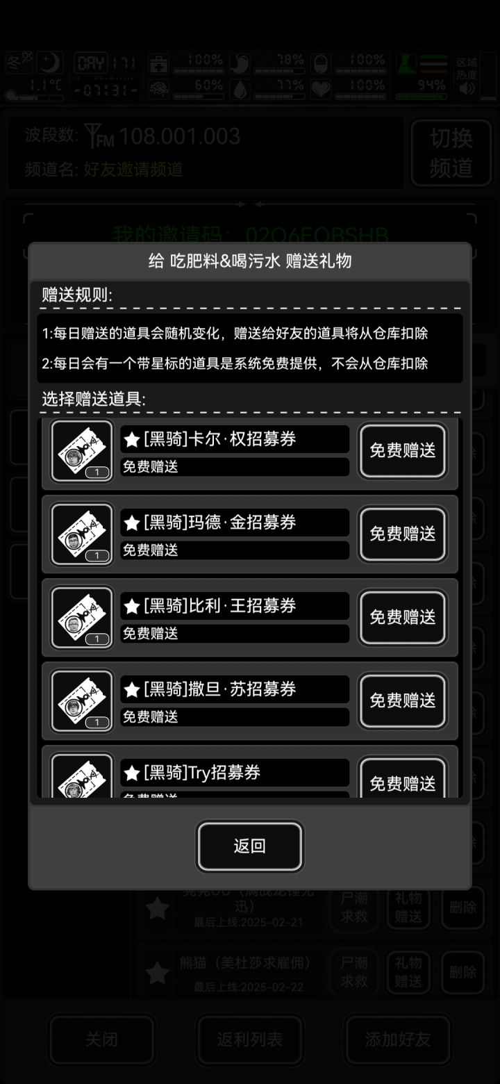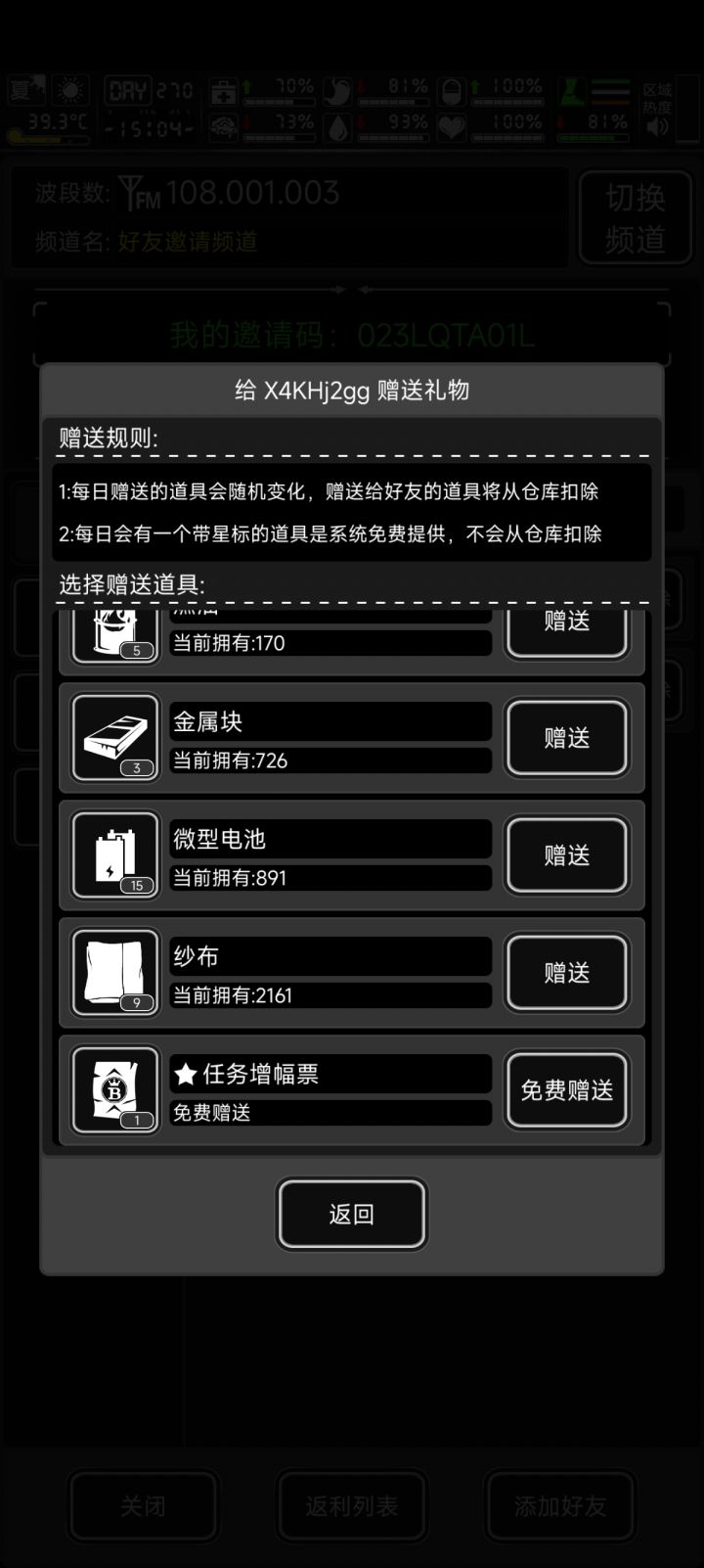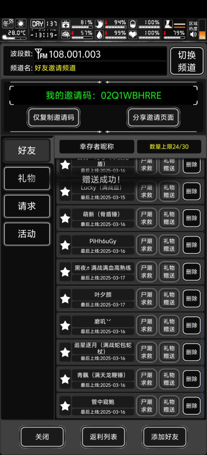 邀请码01开头的是苹果系统,02的是安卓,两者不能互加要发帖子邀请码加人的可以把邀请码发在2楼,方便别人复制复制别人邀请码加人的时候加不了一般是最好多了个空格,删了就好一般送礼物默认只送任务票,藏宝图,机票这些,黑旗的票也可以送来收藏一下,其他的默认为垃圾不送就这些