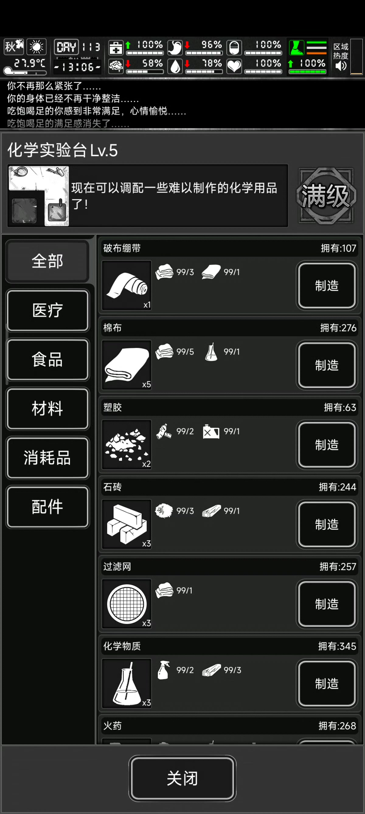 图中制造栏目显示还有35个医用专业绷带,但打开仓库医疗用品那却没找到
