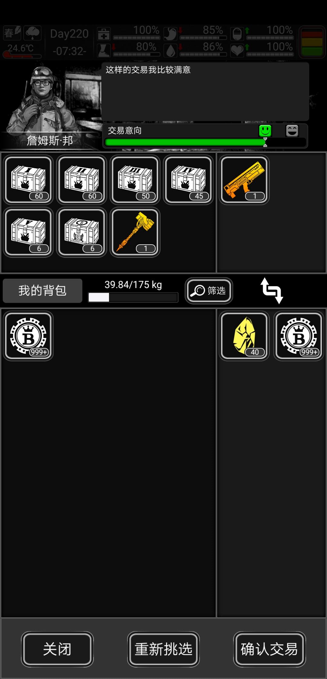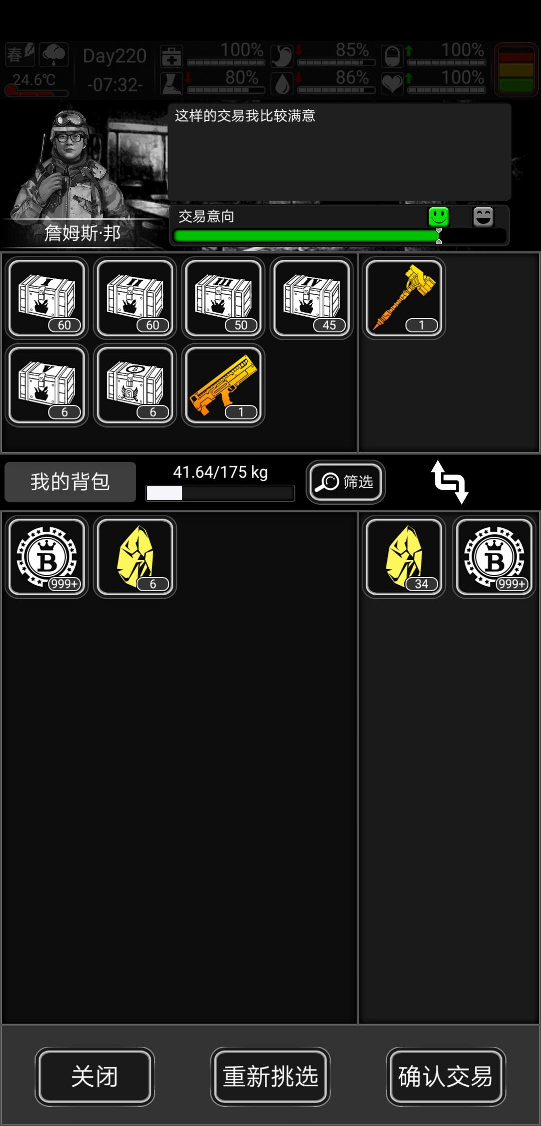 第一次玩到200多天,打了两次八阶,库存已经被耗光了,想换七阶武器不知道哪个好,实在不想用blt打了,音爆只剩了7个,难受,为什么那么多虫子,打吐了锤子好用,还是那把枪好用,我打算换一把另一个就开箱子了