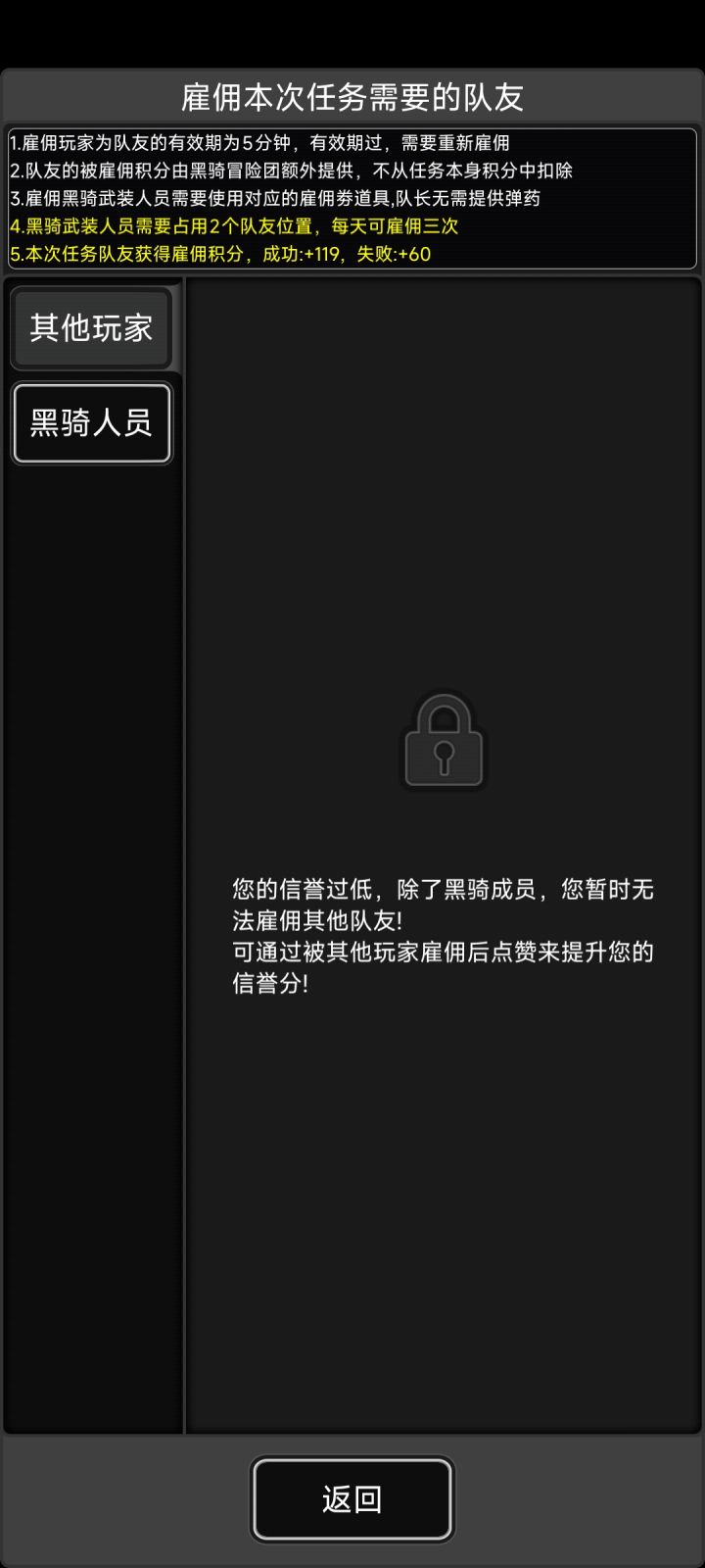 信誉过低,招募不了队友,也没有金的招募劵,变异诡首也能不能刷了,没招了。