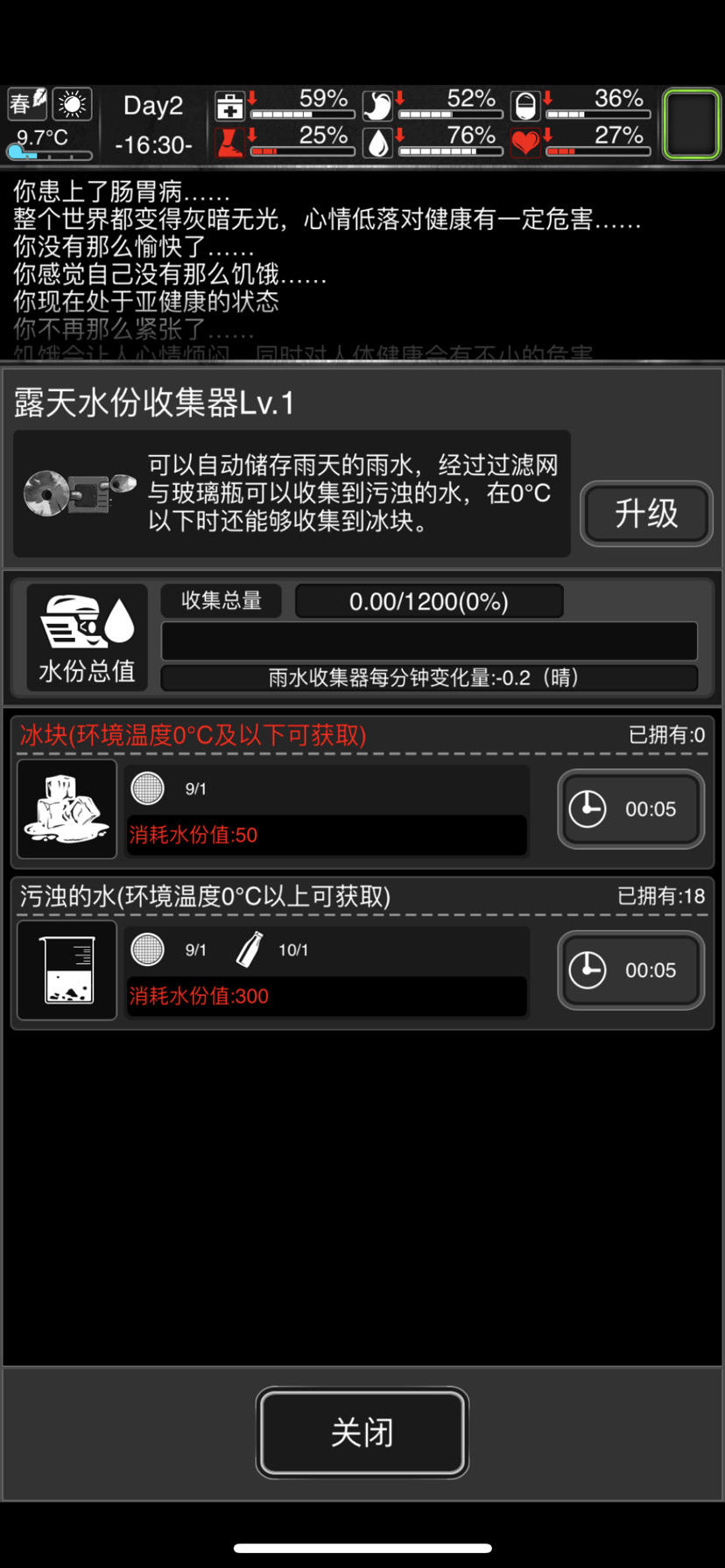 几个问题 求助一下:1. 前期搜索不到食物,吃了3块腐肉。就把健康降了。前期没有食物。只有水 你们怎么过的。(克金买食物包除外)2. 如图,水分收集器 怎么没反应?3. 他们3 怎么离我那么远。我玩剧情模式也就 30分钟的骑车距离。第一次玩炼狱 2小时。 右上角是 圈。4. 前期 你们怎么快速搜索材料的? 我更习惯 勤俭持家,搜光 砸光 捡光 然后 删除 下一个。
