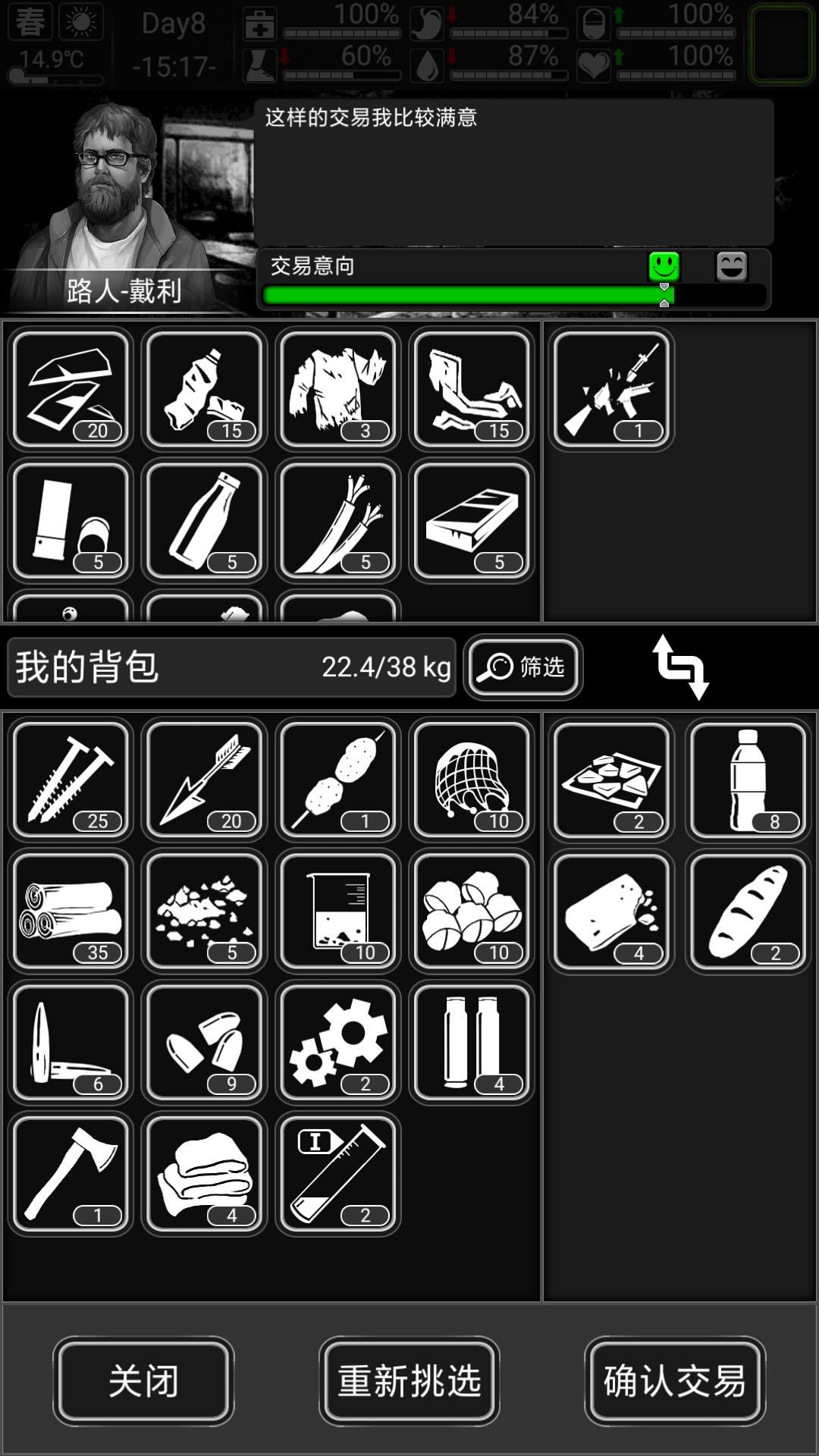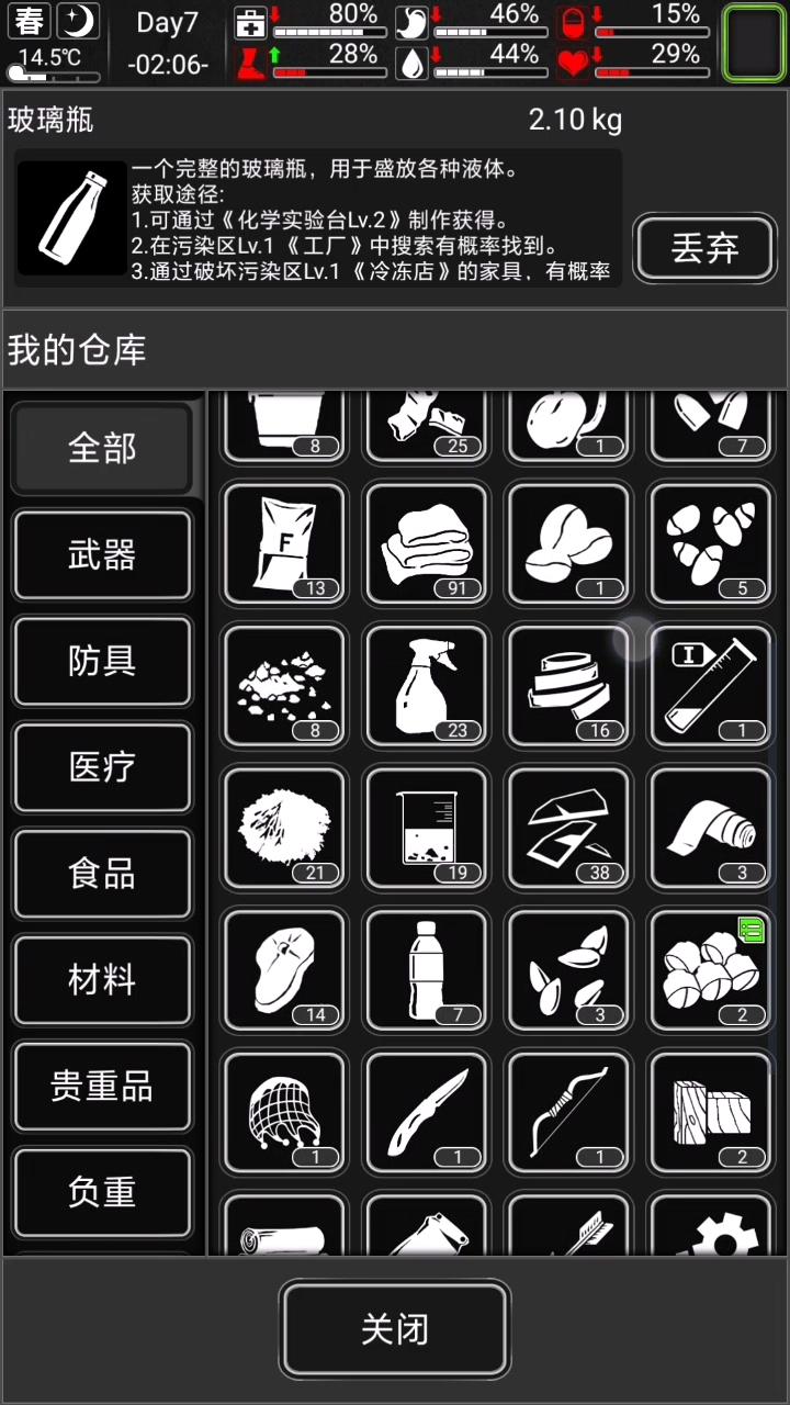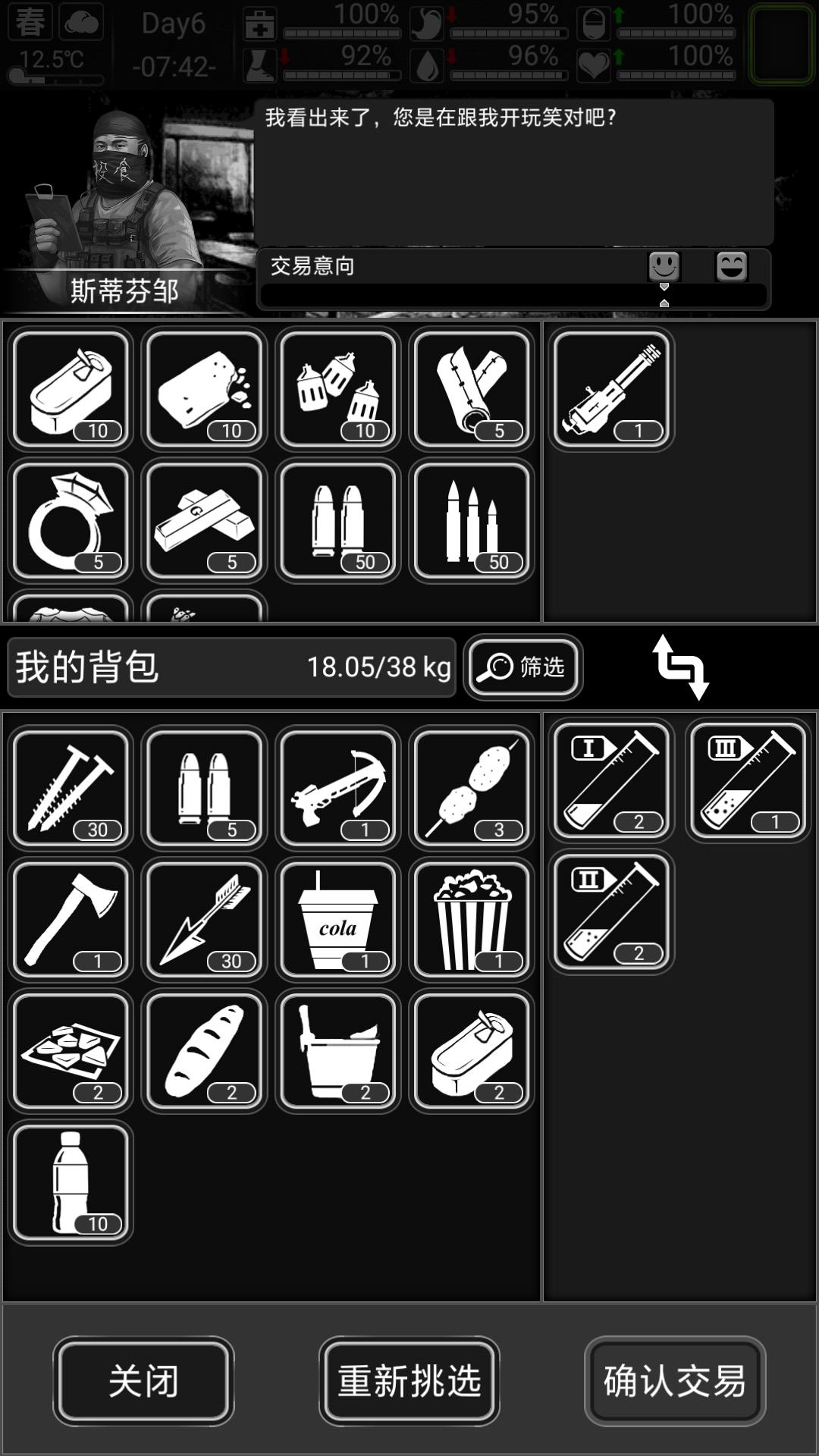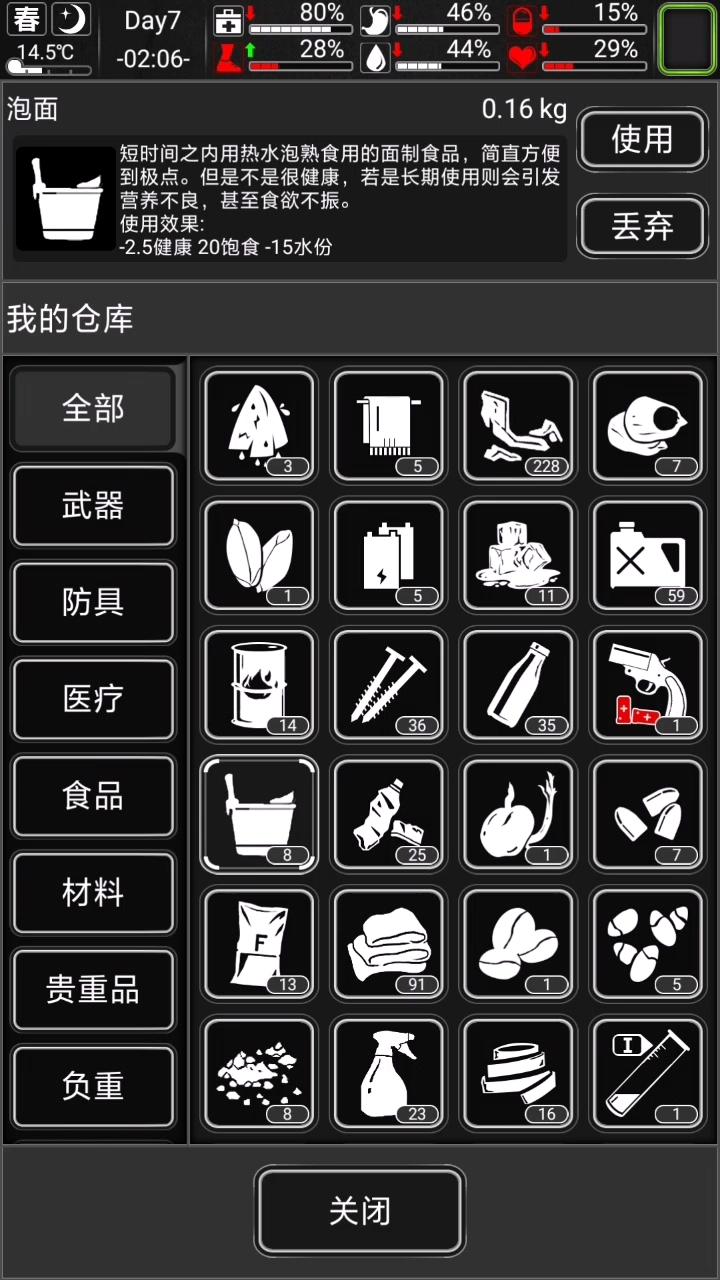 真的是要想要什么就没什么,我刷了二三十个点就出了一个食物站,其他都是在商场,什么刷捡到的泡面加油站和商场给的泡面多,商场的收银柜的货币可以去那里换吃。还有种田要肥沃的土壤,还得去坟场,我都没刷出来过坟场服了,医院里面我刷出来的都是三阶的,打不过,瞄了一眼就走了,健康值就这样没了。有次在商场出了两个密道,进去一看,一个四阶这让我怎么打当时就是小铁铲匕手和个警棍,伤害不高,又不能秒,范围又短,其他的密道我都没叹,想着拿着钉枪在探,钉枪材料太难。水的话喝了快五六十瓶了(污染的水可以喝,我连喝了好几瓶都没事一直以为只有那种瓶装的水能喝),泡面也快吃了四五十桶,然后得了食欲不振,然后又吃不起别的东西田又没有我有好多种子,还有香烟的种子,不知道为什么,健康下降了越来越快因为没有药,然后就亚健康,然后就各种病,然后就死了😅真开心,第一次打到第七天就这么死了,因病而死😓我的探索点里不是商场就是工厂,没有医院,我刷出来医院里都有三阶的打不过,进入食品店开局的时候出来过,然后后面探索就没出来过