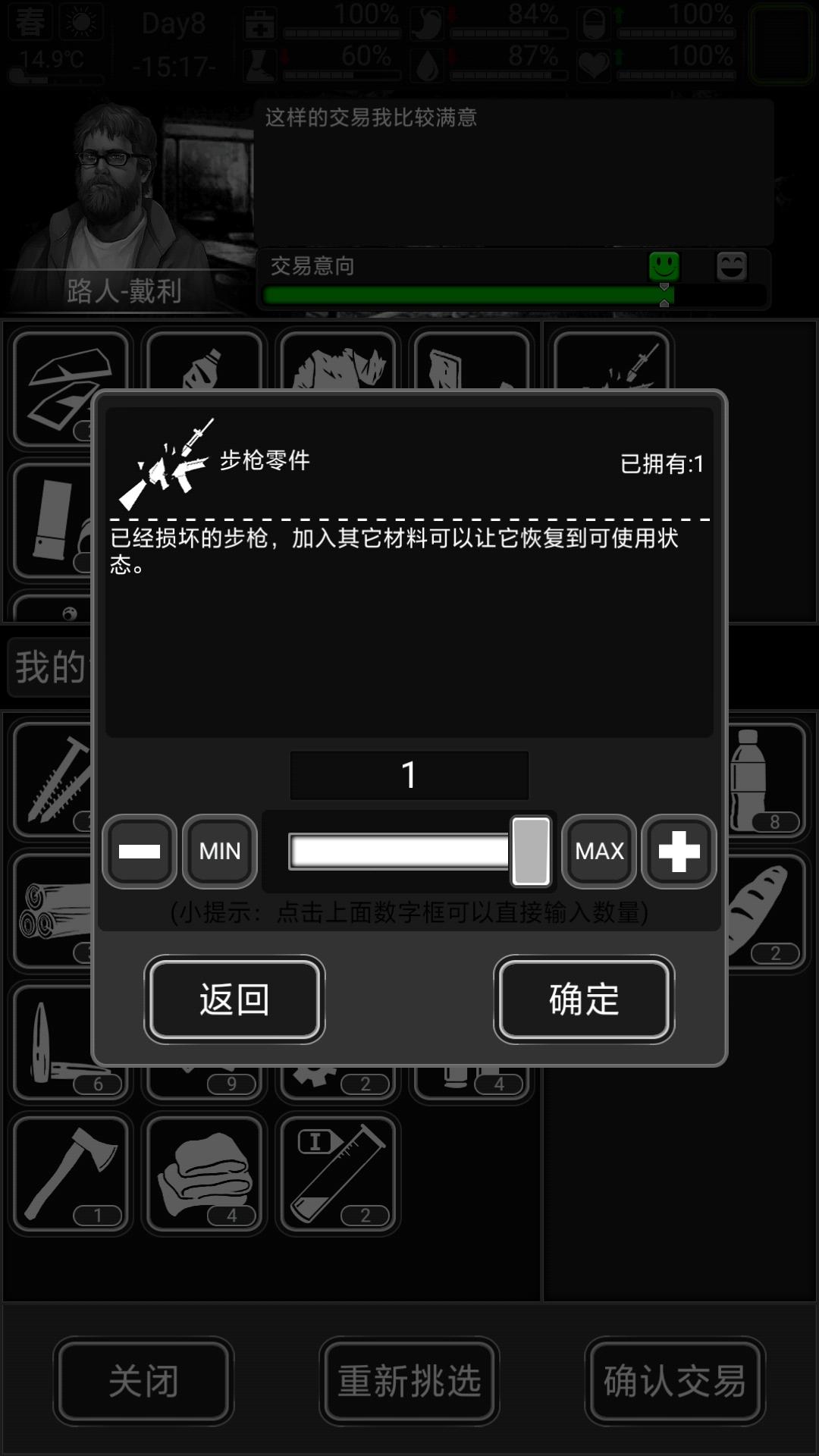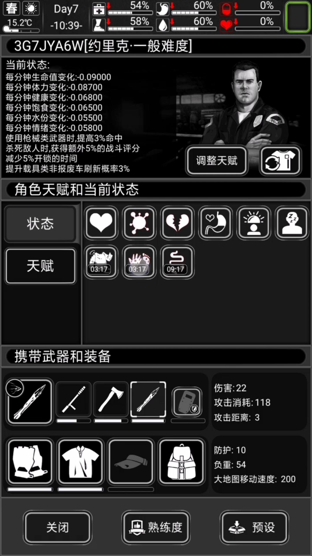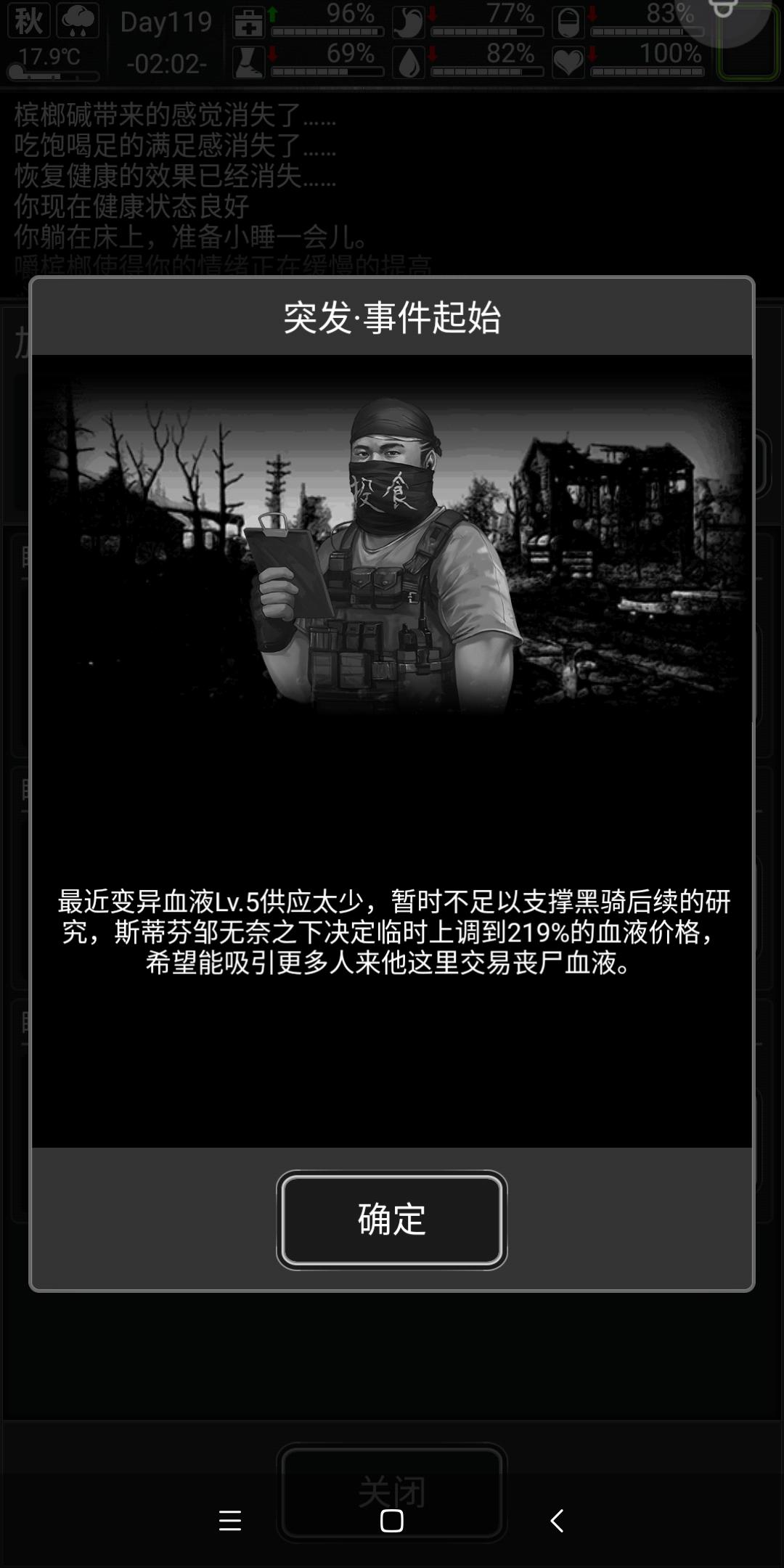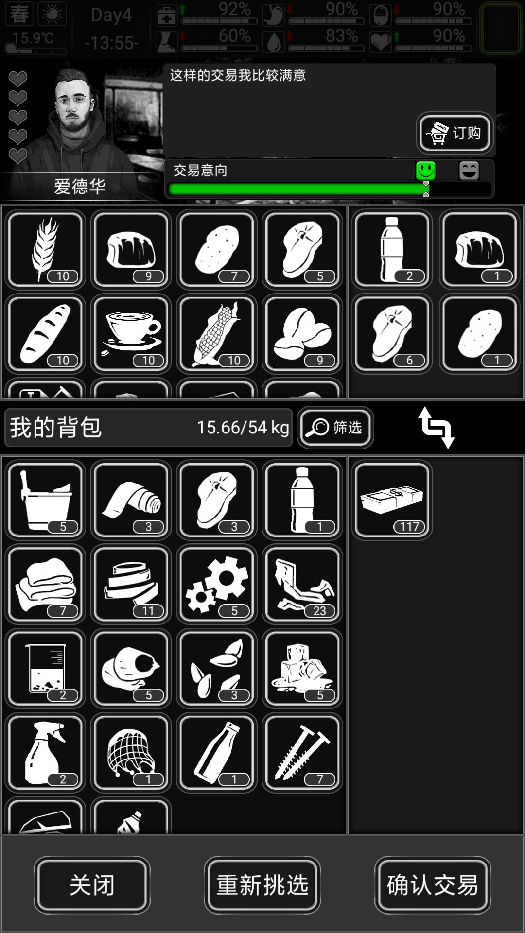 真的是要想要什么就没什么,我刷了二三十个点就出了一个食物站,其他都是在商场,什么刷捡到的泡面加油站和商场给的泡面多,商场的收银柜的货币可以去那里换吃。还有种田要肥沃的土壤,还得去坟场,我都没刷出来过坟场服了,医院里面我刷出来的都是三阶的,打不过,瞄了一眼就走了,健康值就这样没了。有次在商场出了两个密道,进去一看,一个四阶这让我怎么打当时就是小铁铲匕手和个警棍,伤害不高,又不能秒,范围又短,其他的密道我都没叹,想着拿着钉枪在探,钉枪材料太难。水的话喝了快五六十瓶了(污染的水可以喝,我连喝了好几瓶都没事一直以为只有那种瓶装的水能喝),泡面也快吃了四五十桶,然后得了食欲不振,然后又吃不起别的东西田又没有我有好多种子,还有香烟的种子,不知道为什么,健康下降了越来越快因为没有药,然后就亚健康,然后就各种病,然后就死了😅真开心,第一次打到第七天就这么死了,因病而死😓我的探索点里不是商场就是工厂,没有医院,我刷出来医院里都有三阶的打不过,进入食品店开局的时候出来过,然后后面探索就没出来过