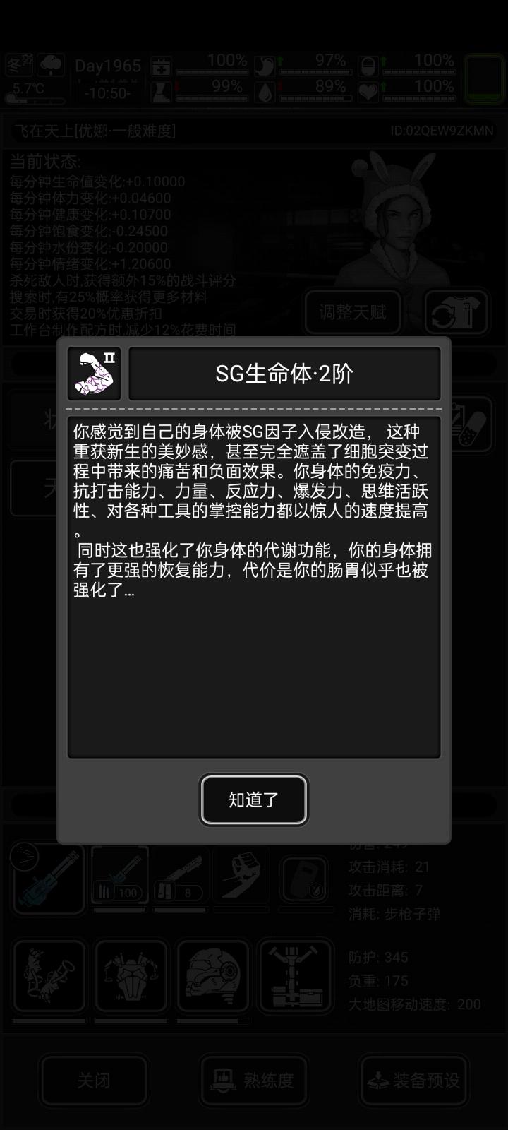 如图,属性和一阶的一模一样还是我记错了?伤害仍旧加10%补图,是无尽2阶生命体确认了。2阶sg和1阶属性基本一样,差别在于2阶多50血,然后健康、饱食、水分掉到0好像不会掉血,回血速度快些