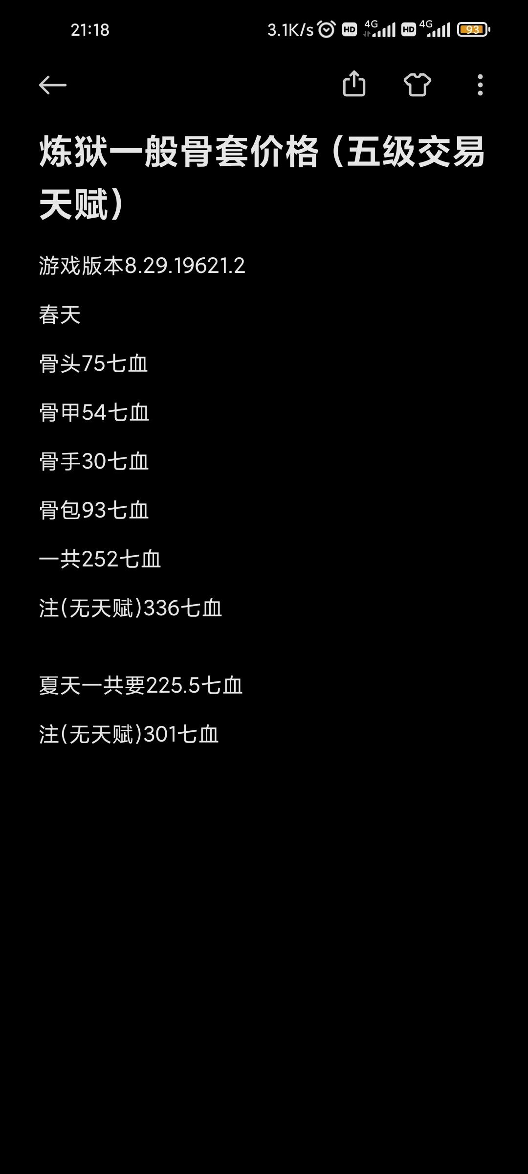炼狱一般骨套价格注(可以按照自己的交易天赋折扣计算价格)