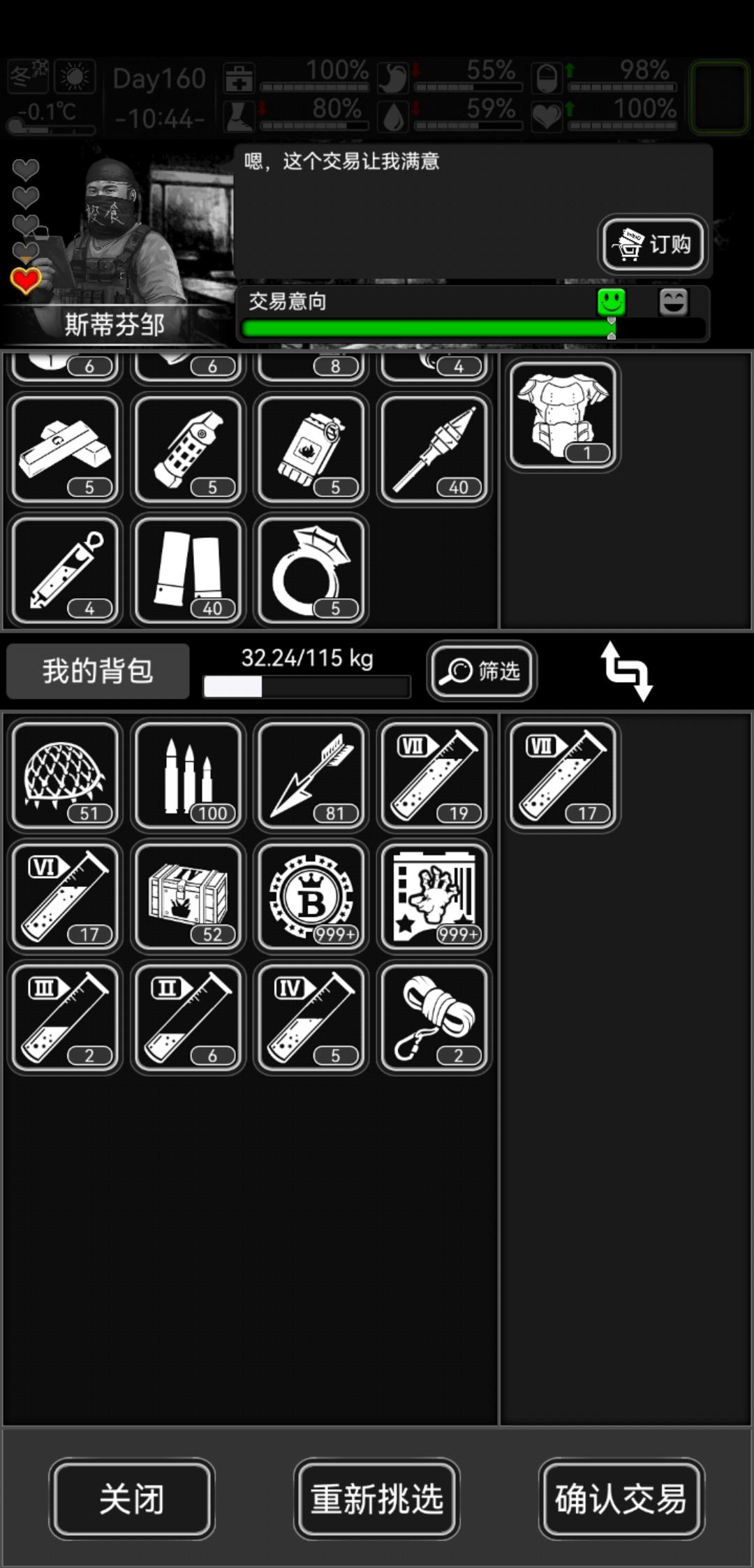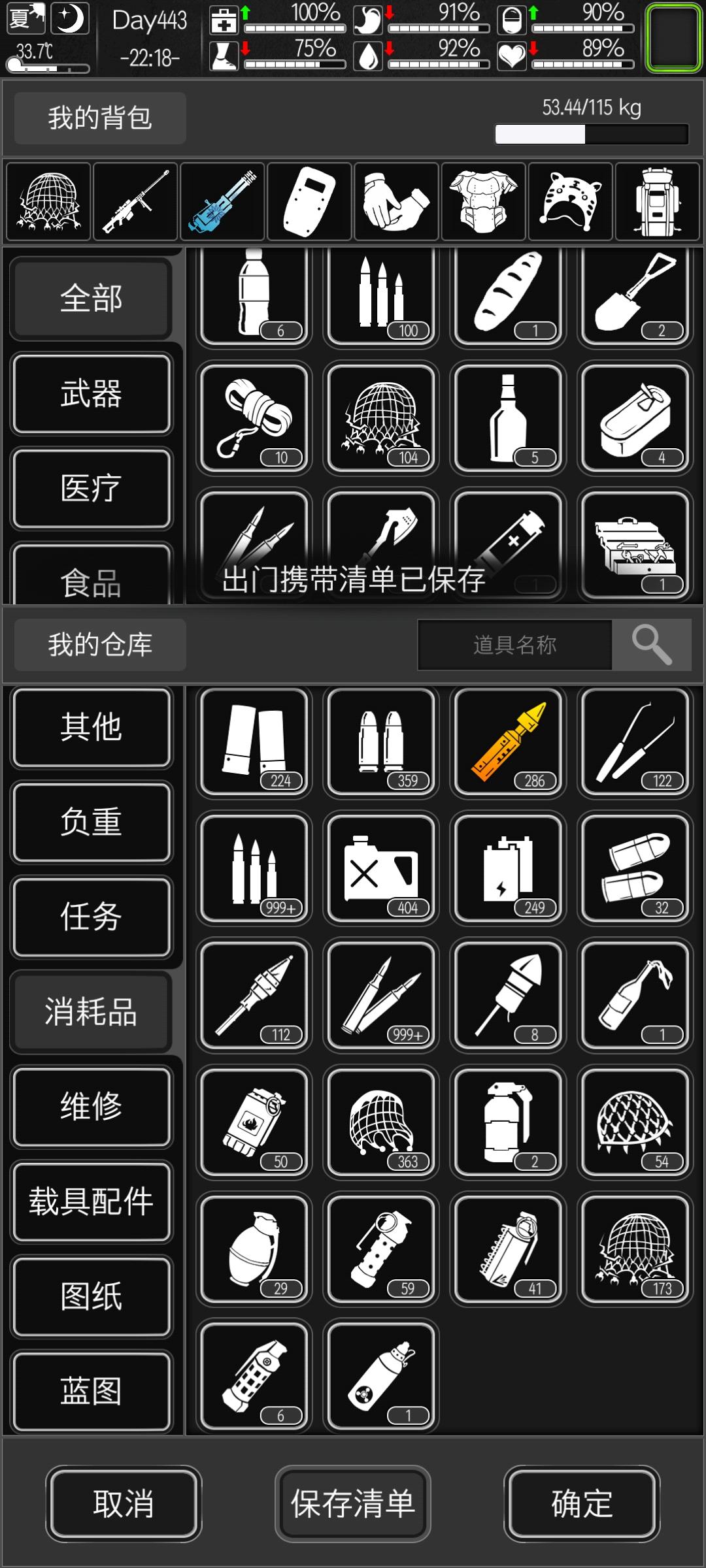 大佬们,想问一下我加了很多巴雷特子弹保存清单里,但是再次出门还是只有带枪后的30发,每次出门都要一次又一次重新加子弹,好麻烦啊。大佬们知道怎么解决吗😦另外记录一下历时游戏六十多天第一次打完的八阶任务,😨最后一层终于没有一个翻车虫,激动的差点跪下。期间死过多次,还因为死亡而卡住〈已经更新了当初卡住bug的修复〉两次导致重新打翻车虫,真太激动了,另外水天数刷商人真越来越得心应手