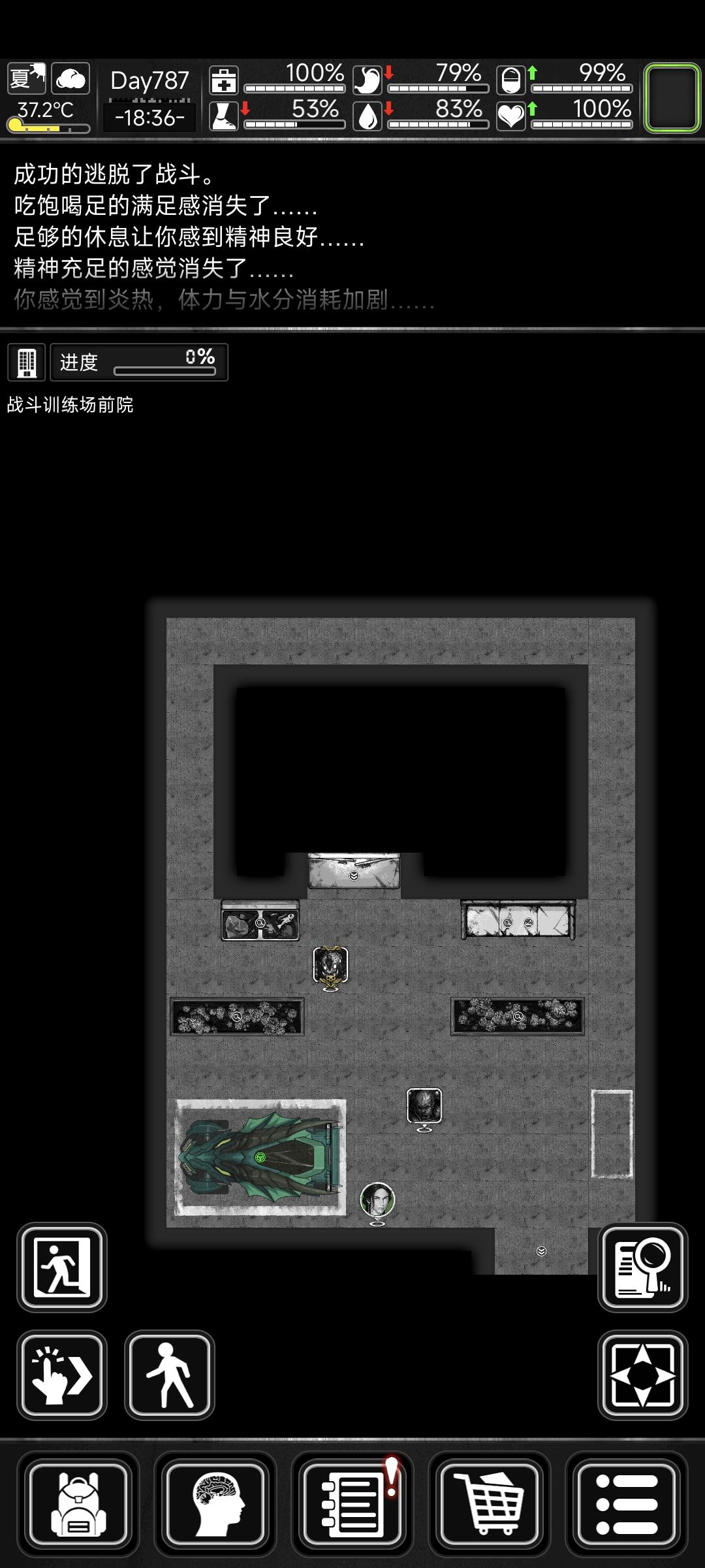 蹦迪自动化思路配置:武器:普通碳刀(清小怪)+十多把极开碳刀(清大怪)+军霰(补噪音)+两个合金盾防具:头部防中毒,身体和手套防割状态:sg血清2阶及以上核心思路:在门口左右走,平均5~6分钟一只怪,利用碳刀盾反即可低损杀怪。点位检测:点位1:检测是否出怪。出怪的时候行动条与不出怪不同,利用点位检测可以判断是否出怪,出怪之后就左右走一下持盾让怪物吃反击。怪我死后继续左右走。点位2: