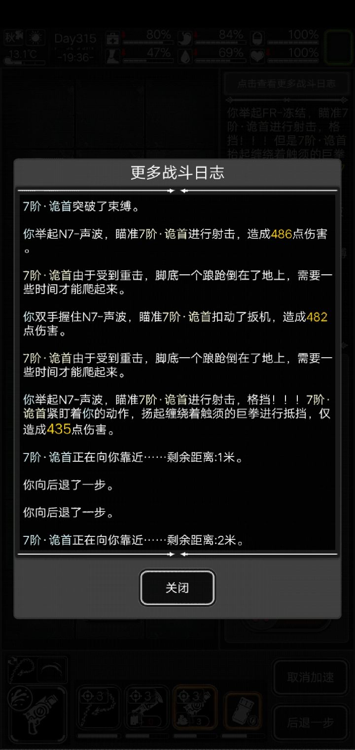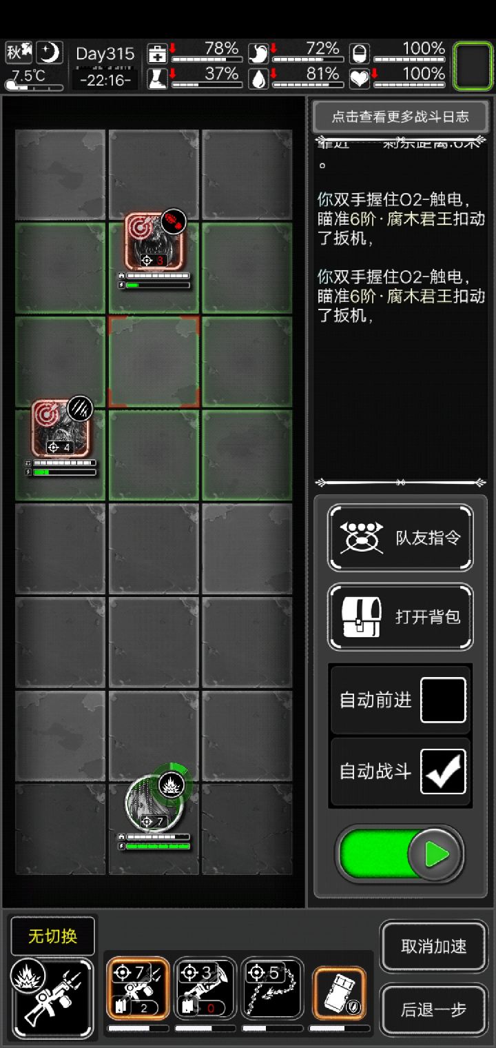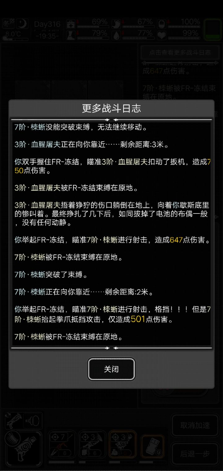 变异腐木原来可以无损击杀,队友龙鞭(两都是普攻,随缘刷的),开局后撤看情况,见到藤甲或者喷毒前摇就立马逃跑,就让队友尽可能多a,配合麻痹和击退挺好拉扯的,队友适当后撤,冲到怪脸上时跑不了,自己就隔岸观火或者看情况上去补刀。今天做6阶清剿任务,8个点轻松做到只剩1个食品店,结果没有存档习惯,硬着头皮遇到了一层就3组腐木还硬打,我主要战力也是龙鞭,30发高斯,30发自制燃烧瓶,队友死光只剩个龙鞭才打