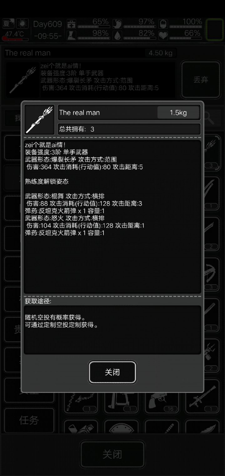真是不用不知道,一用吓一跳。这东西90天可购买,40天可接收寄送,在一堆低级的武器里凭借其不错的破甲线配合网就可以单杀所有七阶怪。耐久90,一个3级包修10,4级包修满,而且实测可以吃到棍棒天赋(咱也不知道为啥)。假如忽略弹药问题,这东西可比重弩电锯之类的传统开荒打尸潮武器好用的多。因此如果是萌新还是可以考虑40天的时候寄一根过来的