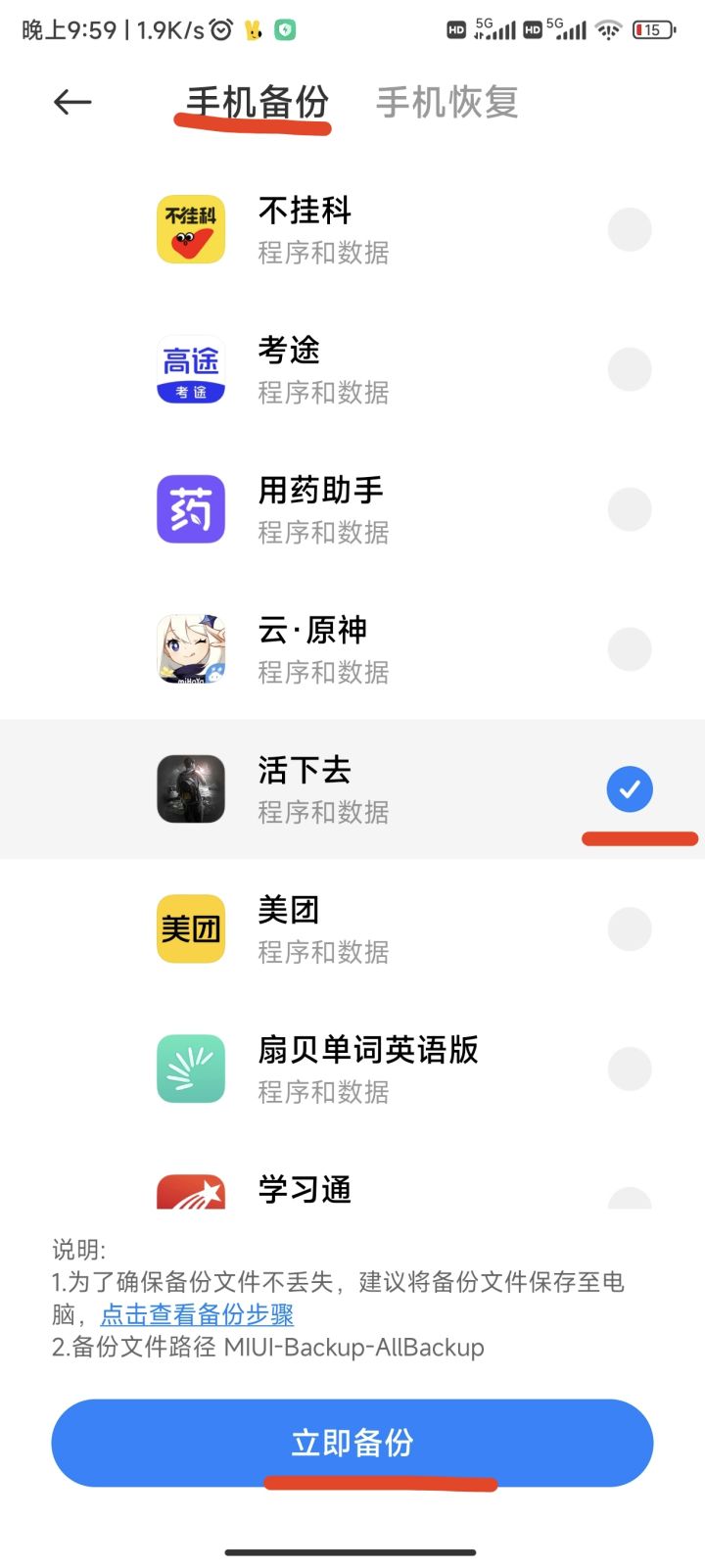 考虑到最近服务器在遭受ddos攻击,故分享一下红米(也有泛用的方法)备份游戏,其余手机建议备份后先试一下,听说有的手机不备份存档,游戏里刷个一两天再恢复,如果天数变回去的话,应该就没问题了红米手机:图1-6首先是备份,基本都在设置里找,红米k50是设置-更多设置-备份与恢复,第一次要设置密码,然后就进到备份功能的界面了,点手机备份恢复-上面选手机备份,勾选程序后点立即备份,就备份好了,手机备份