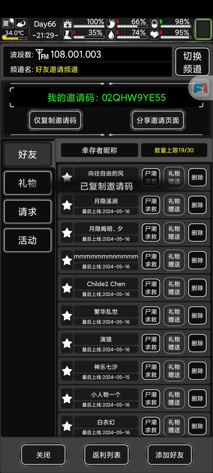 邀请码:02Q9W6XCTH刷出来烟瘾或者酒瘾,主要是利用戒断无限睡地板准备好几十天份的生土豆,水,抗生素,以及少量绷带/治疗弹,以及邦的奥数书(可没有)上传云存档带上十几天份的生存物资,徒步去最近的探索点,进门(主要是露天有可能中暑和冻伤,很麻烦)反复睡地板+吃东西即可,在戒断反应期间不会睡到精力充足戒断到1级快消失的时候补一根烟或者酒,续住烟瘾或者酒瘾,然后继续睡地板我用酒瘾戒断