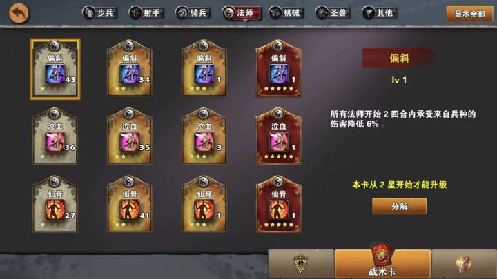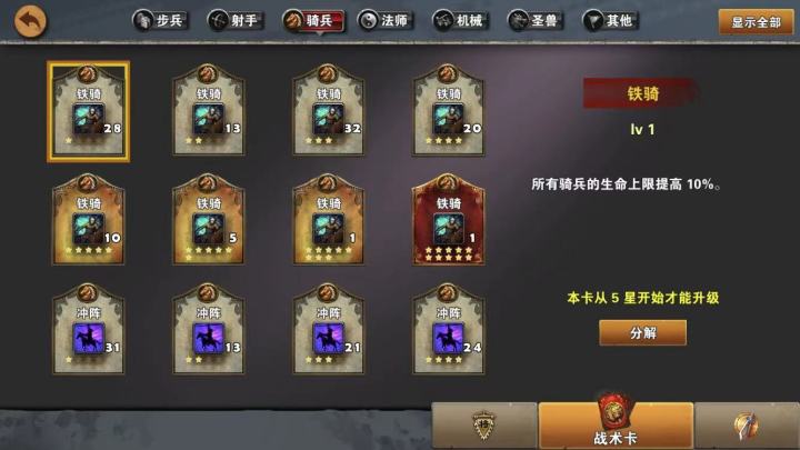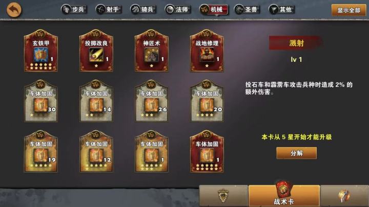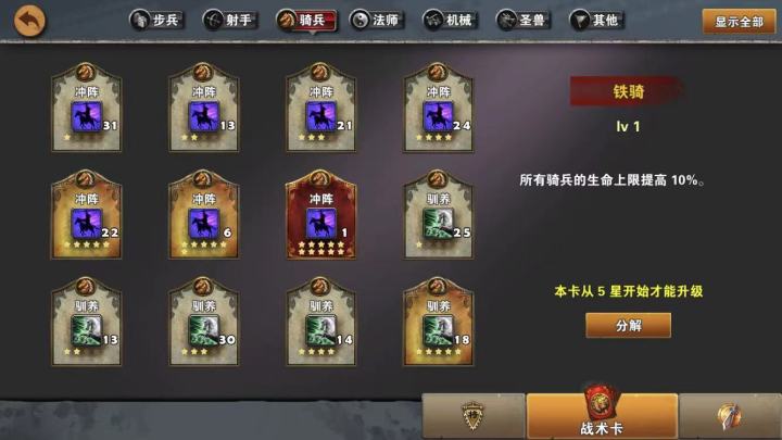 策马三国志的游戏福利。每日都能抽取几张战术卡片,日子久了也就存的多了。平常也是本人太懒就没有在意,也没有分解。今天一看这么多了,能不能加个一件分解的功能,一个个的分解实在是太麻烦了,一个小小的建议,希望官方考虑一下。
