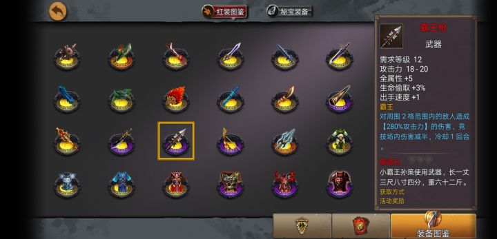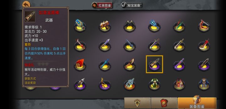 策马所有的限量装中,只有这三分之一是能用的,属性还行,技能比较强。为了匹配上前面3期修改意见,这里的限量装做一下属性和技能增强。如意金箍棒的技能不错,但属性实在太差了吧。新属性:攻击力30-40武力+20出手速度+3蓄势:每3回合获得强化,提升100%伤害和5点出手速度。当头一棒:敌军数量为1或者3的倍数时,对其伤害增加30%。饕餮铠甲,属性也不错,技能也凑合,竞技场装备,过图弱了