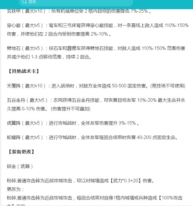 策马最新发布了新策略卡。我个人评价一下碎金以后可以配黑熊同时出道,许褚有登陆竞技场可能,等更新后开测,此条随时更新。蛇蟠阵如果可以更改成全局/不限制场地均有效,哪怕效果减半都是非常意义重大的生存卡。目前只能针对前期关卡(1-5章节),实用度打折。虎翼阵,鸡肋,策马守城战城市提供的减伤最大高达48%,区区15%,难登大雅之堂。仅仅是凸显了英雄更高额的技能伤害,对兵种来说根本看不到效果。天覆