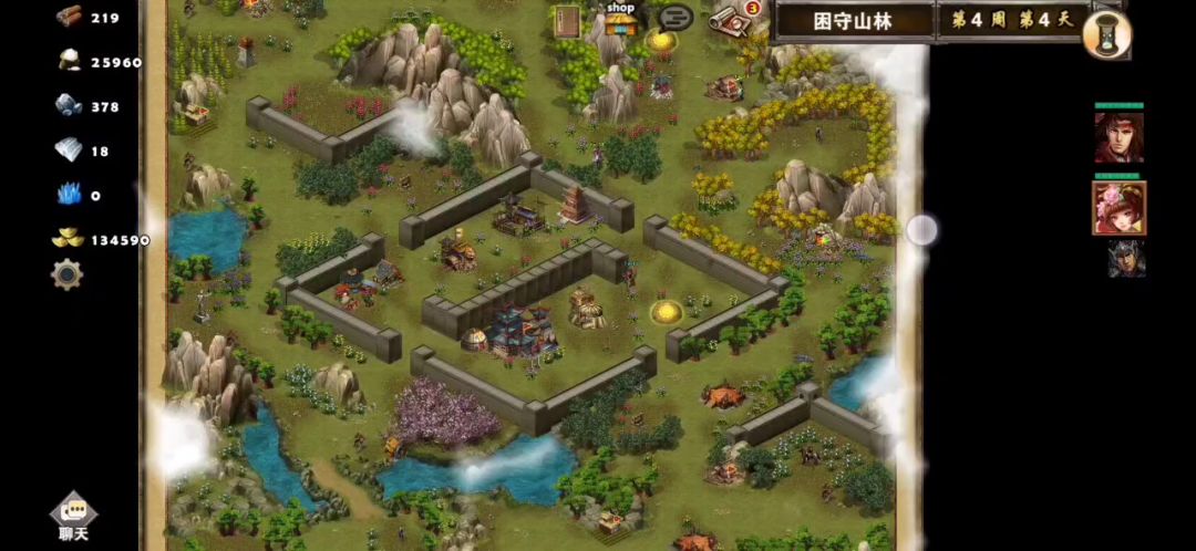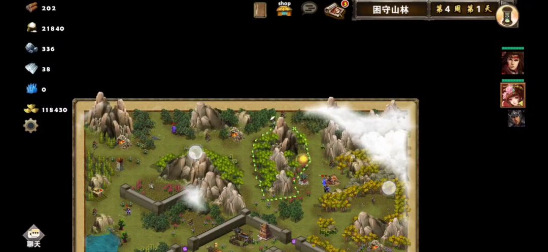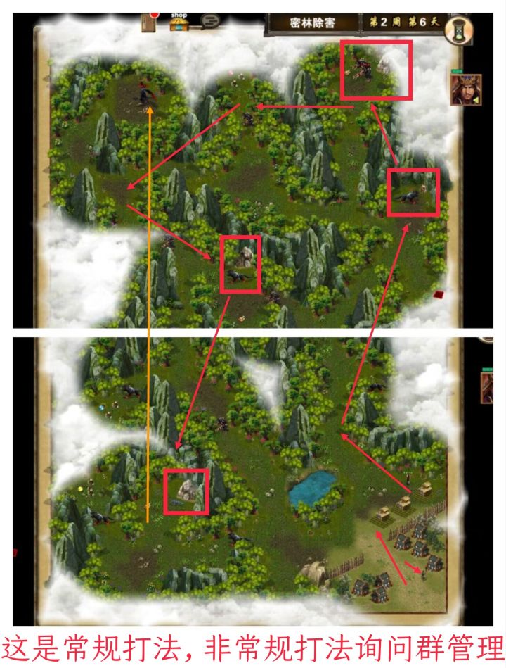 先拿英雄为快。第一关攻略出卡:粮食卡清野出装:火扇套+水镜头打BOSS出装:黑风镰刀,龙甲(饕餮),虎金头,夕兽护腕(东皇钟),八卦,黑熊(赤兔),猛将靴开局对话农民提示3周内过关(3周7天),占3座农田。一路火扇扇小兵无压力,如果血低了可以最后剩一队敌人不打死,利用吕蒙被动技能放风筝回满血。图中有3处招兵的地点,都去招了。最好打路上小怪的时候保持无损。打最后boss,我招了6只夕兽分4
