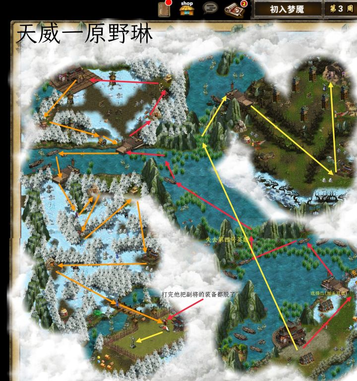 路线顺序:红箭头→橙箭头→黄箭头英雄推荐:输出(贾诩)、酱油(张飞)、辅助(刘备)、酱油(关羽)英雄出装:贾诩:朱雀羽扇、天玄道袍、清灵头(万灵头)、将军鞋(虎鞋)、招财猫、龙佩、太平要术卡片出装:准备就绪、战前准备、粮食卡、木头卡打法思路:后期兵多,走屯兵路线。开局把英雄选好前期就很轻松,兵种推荐:鹰卫和妖术师。开局可以选择4个英雄,第1个选贾诩/诸葛亮作为输出。第2个会陪你一段时间