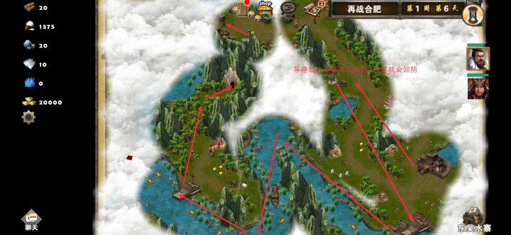 第二关出卡:粮食卡,金币卡,包罗万象出装:孙权火扇套。鲁肃九天惊雷仗,九色鹿(赤兔),灵法鞋,金衣(蓝玄衣),莲花,兵书,清灵冠。全程鲁肃打,孙权占捡资源打打小怪。拿金箱子支线任务的可以拿了退出去重新开档。主要说下支线任务金箱子拿完打张辽。开局鲁肃中间往上跑,第二天打李典。1技能招出水鬼卡鹰卫,慢慢卡,很简单。打完李典张辽不再行动。下水,过去上岸,绕后方,树林那里可以串过去。去打乐进,