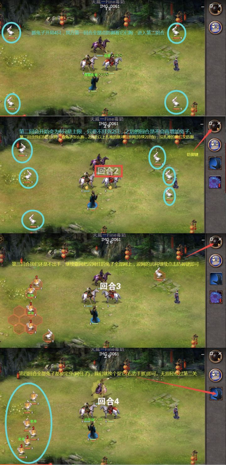 嫦娥的兔子是难点。也是浪费时间的关卡。本方英雄没技能,只能抓(普攻)兔子和扑网定身兔子。开局是4只兔子不会攻击你,乱跑。抓兔子,让兔子跑3回合,英雄待机。第三回合全部放网抓兔子。避免四回合兔子集火攻击你造成损伤。也相对来说简单。