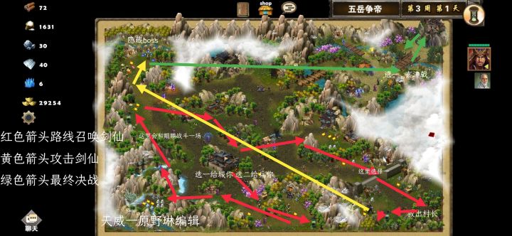 图片一:红色线段→黄色线段→绿色线段(这是路线图)出生给你两个选择选择一把城送给你还要自己发展浪费时间,选择二给你兵。果断选择二,把射手升级为鹰卫,路上只拿粮食,黄金,木头,行动力黑宝石,属性石。其他物资不拿跟着箭头指引扫荡就可以了。图片二:红色方框里是解锁隐藏boss剑仙的机关需要激活机关剑仙才会出现。黄色方框是剑仙现身的地方。紫色方框是打开剑仙路口的封印。绿色方框是九黎村长的所在