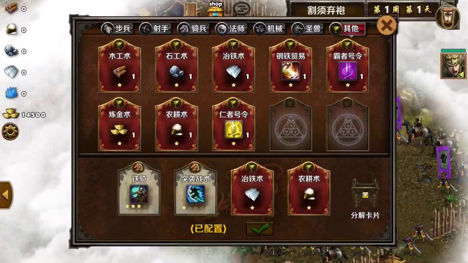 1.战术卡:铁骑,突袭,然后粮食卡,铁矿卡。2.开局先打曹操3.打死曹操,然后往左边跑,学习技能,然后顺便杀路上的小兵,杀小兵有资源。然后去买骑兵。升西凉打就可以了4.开打,放视频