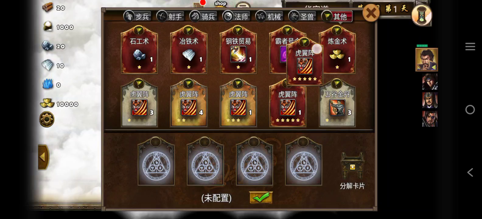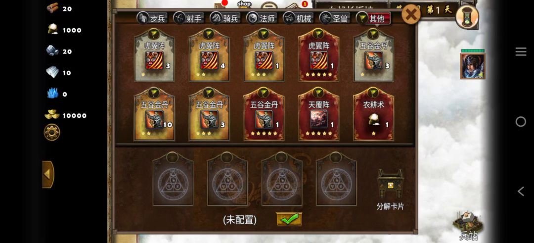 木工术:每天可获得3木材,必备资源卡之一,想要获得这张卡需要完成训练达人成就,首先打开成就系统点开左下角成就,可以看见第一个成就训练达人,需要在通关黄巾起义关卡时,队伍里有100+白耳兵和100+鹰卫,这个比较简单,只要刘备统率达到75便可以训练出白耳兵,地图中有两座神庙可以选择加20统率,另外打掉右边青龙可以得到一个加2统率宝石,还有首次打败张宝可以得到全属性加5加成,这样算下来刘备统率在未进