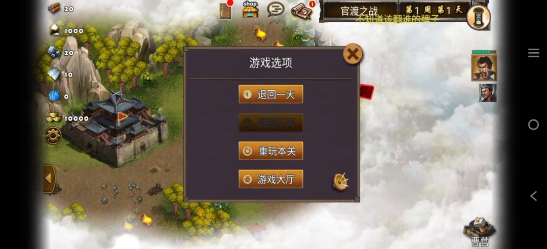吾乃河北上将,颜良!我乃河北上将,文丑!插标卖首之徒,鼠辈,受死!关羽于万军丛中,刺良于马下,斩其首而还,绍诸将莫可挡者。又遇文丑于延津,文丑自知不敌,拨马便走,关羽赤兔马快,追上去手起刀落,诛杀文丑。本关呢关羽必须要有能力在一天内干掉颜良,否则游戏失败。后面可以慢慢屯兵去干掉文丑。像我肯定是两天过关。单杀颜良没难度,2将杀文丑更是没难度,这里选贾诩,以后带来其他的。