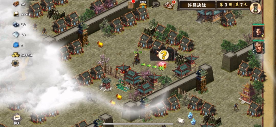 3周7左右吕蒙这边有个金色神秘宝箱,要刷到贾诩的连锁施法技能,好郁闷,刷了好久才刷到,然后鲁肃那边去打郭嘉傀儡,如果鲁肃有兵分组会更好打,我当时打贾诩的时候把虎豹骑全招完了,现在没兵了,鲁肃一个人也不确定能不能打得过郭嘉傀儡,没想到最后还真打败了郭嘉傀儡,然后鲁肃回去准备再去招募虎豹骑,等待下一场战斗打司马懿,吕蒙这边往左边走,可以看见许褚带着大部队把路口堵死了,先做好准备恢复好状态,准备随时去打