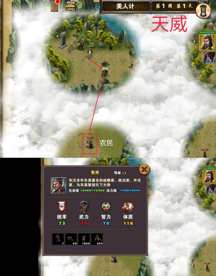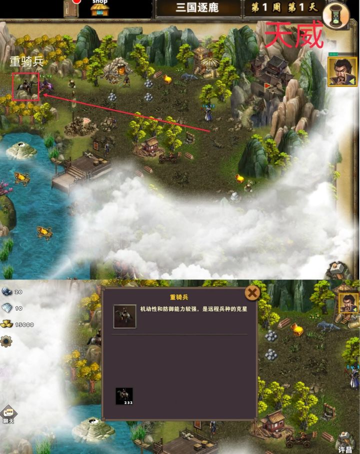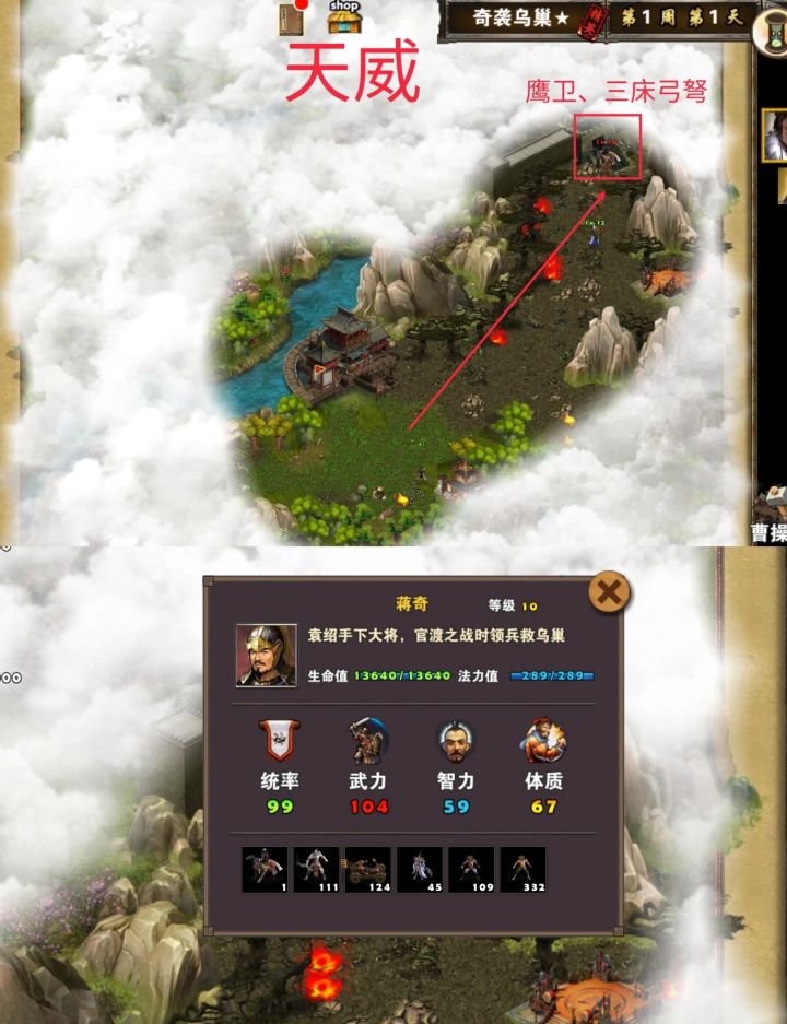 这关,由于英雄需要有一个发育的过程,因此时间也会较长,我目前通关是26分钟,如果其他大佬能更少时间,也请给予指点。 首先,我选择的貂蝉作为主将,曹操,贾诩作为副将辅助。 然后进场,第一个区域,开局最好是出现马厩,可以招骑兵,然后就可以直接去打小boss到达第二个区域。 第二个区域,这里最好就是马上出霸王枪,回蓝头,会影响到通关时间的快慢,如果出卧龙衣也可以选择。在这个区域一定要去吃双动的技能,