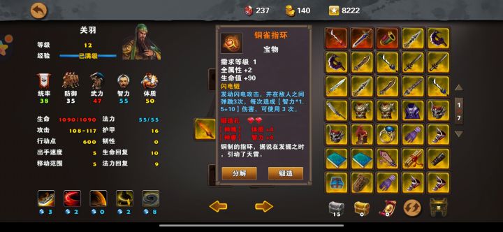 第一章总的来说是给大家一个熟悉游戏的章节没有什么难度,下面给大家盘点下第一章比较实用的几个装备不分前后。第一个铜雀指环佩戴等级1级,出来就可以用没有等级限制,第一章的“神器”。附带闪电链技能。第二件雷鸣指环佩戴等级3,这是个加强版铜雀指环,附带技能雷鸣实用雷鸣会有蓝消耗。伤害和智力有关。第三件火精剑佩戴等级4级,也是第一章“神器”,开始战斗时被动发射一枚火球,伤害和智力有关。点开“剧