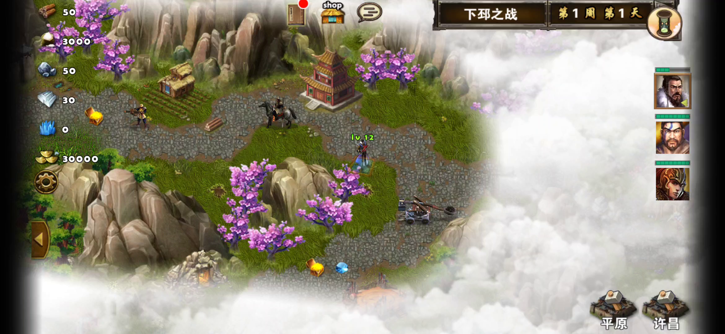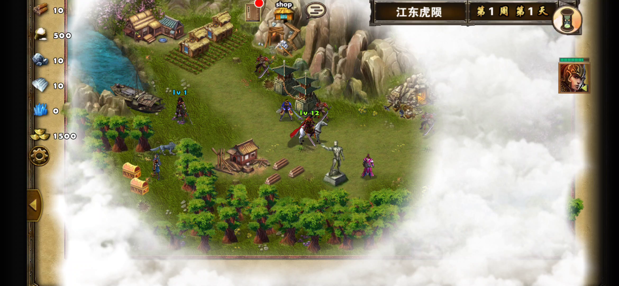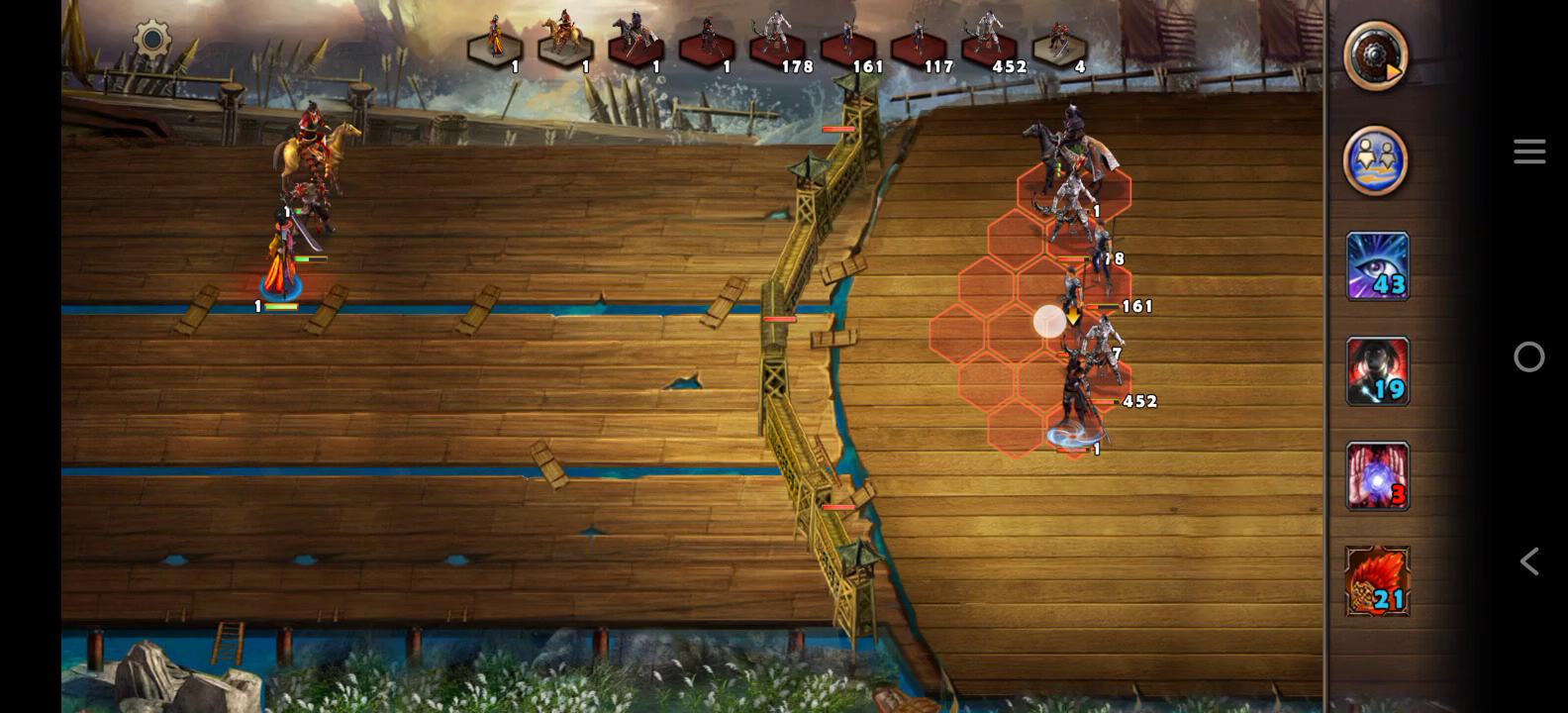 这关我选的是关羽穿的血煞套,第一天吃武力属性射手分组可以无损过,第二天选关羽刘备穿的标准的辅助装,吃的移动力buff招了周仓当炮灰,当然也可以不要接着准备坐船到对岸这里有个小技巧我们不主动打他他会来打我们,这样场景里就没有植物之类的阻碍物。