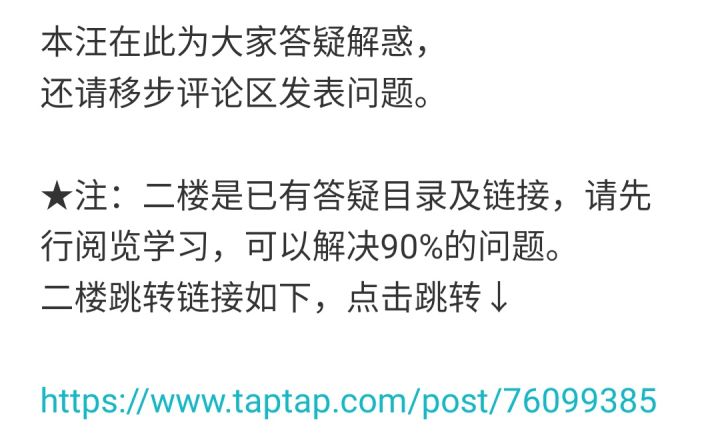 【多位网友反应排版会被跳,所以我把全部帖子图片化了,tap内部链接可在首页搜索蓝色链接后方数字来跳转。原文也在后面以供不会跳排版的方便直接点击跳转。】本汪在此为大家答疑解惑,还请移步评论区发表问题。★注:二楼是已有答疑目录及链接,请先行阅览学习,可以解决90%的问题。二楼跳转链接如下,点击跳转↓https://www.taptap.com/post/76099385