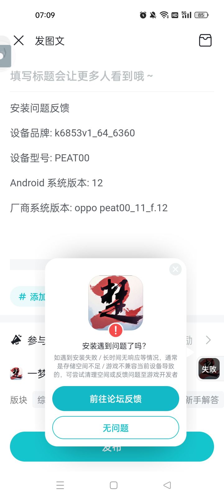安装问题反馈设备品牌: k6853v1_64_6360设备型号: PEAT00Android 系统版本: 12厂商系统版本: oppo peat00_11_f.12