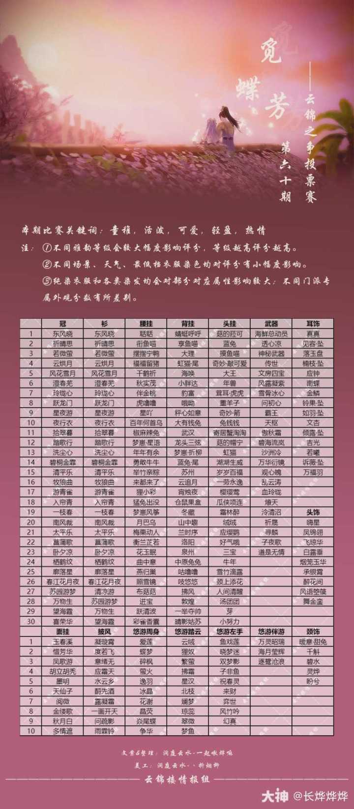 【云锦之争——道是寻常篇】投票赛第六一期 相关属性:清冷·浪漫·简约·豪放·仙逸攻略范围:冠241+衫223+腰挂126+背挂155+头挂85+武器23+面挂23+披风21+周身13+踏云10+左手9+伴游3+耳饰28+头饰9+颈饰5,共974件。——转载于长烨烨烨