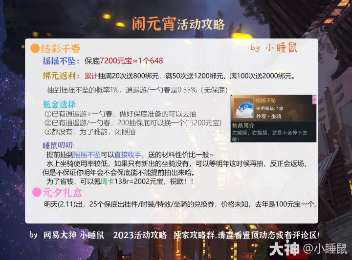 闹元宵活动攻略合集!结彩千春、元夕礼盒、千灯愿、天落云锦、青瓷探珍、兔年限定、千灯小铺、升平市热门道具及氪金数攻略来咯——转载于小睡鼠