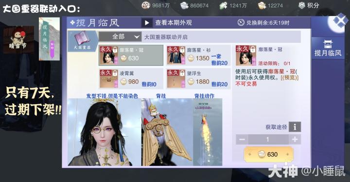 大国重器联动,明码标价,但是只上架7天!!!下周更新新活动就关闭啦!做剧情任务送15天的,现充周卡的话只能买套衣服了——转载于小睡鼠